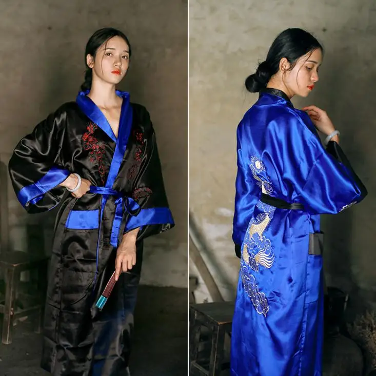 Кимоно женское атласное, двустороннее, с вышивкой, ручная работа, ночная рубашка с драконом