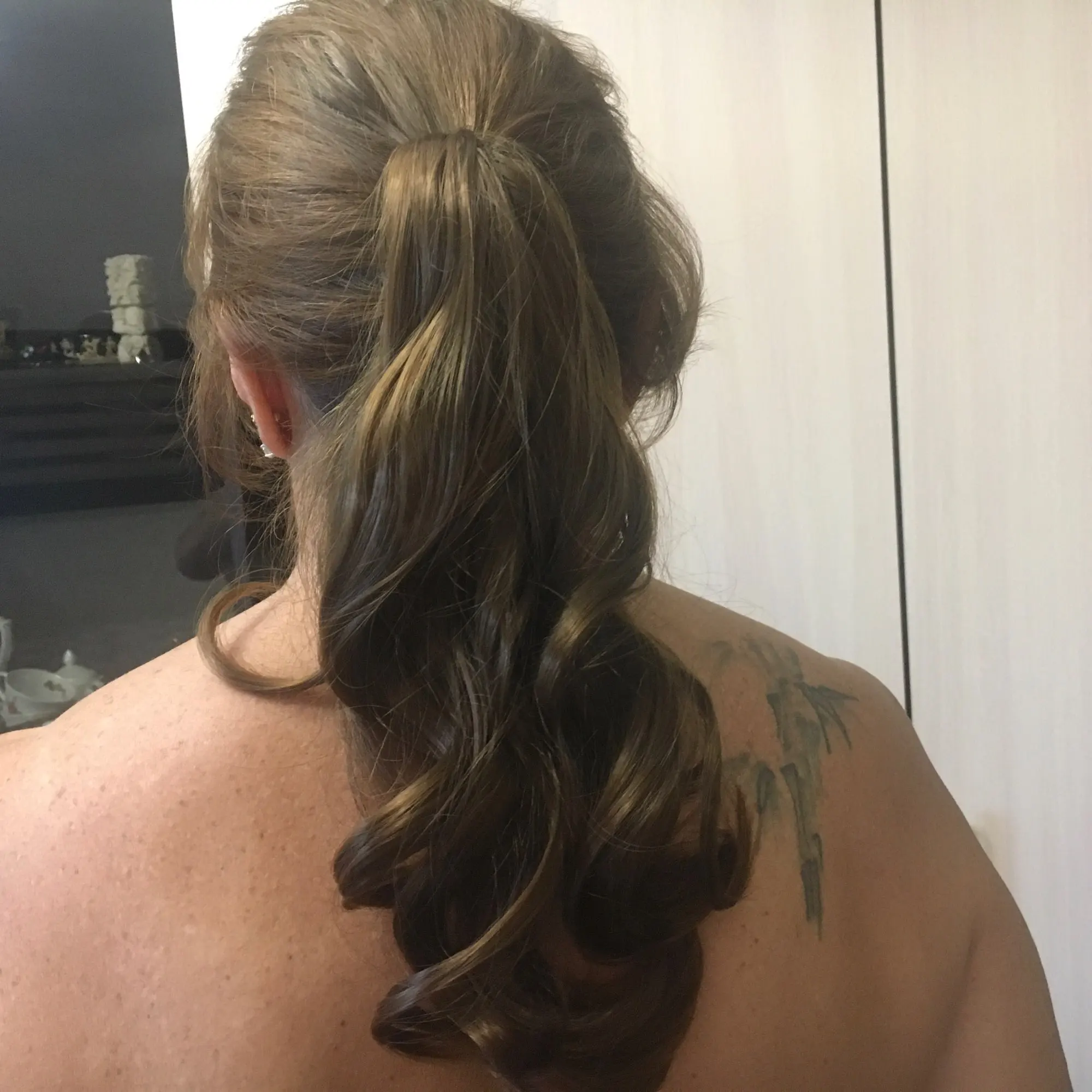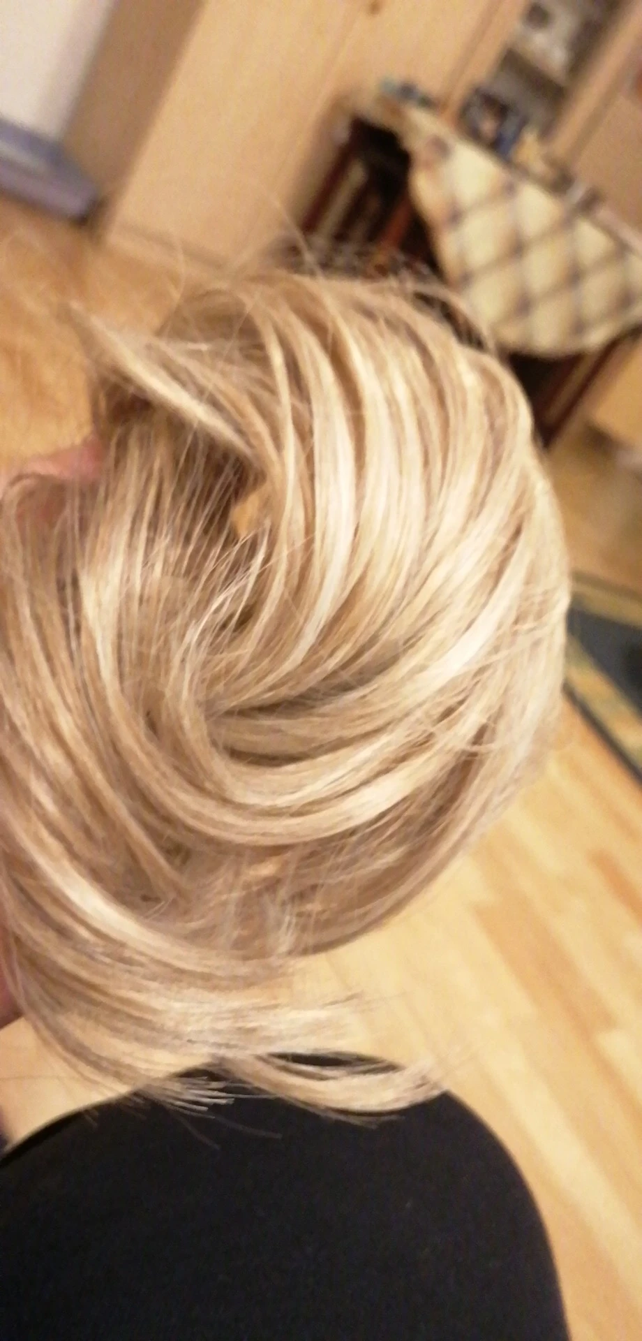Хороший шиньончик, волосы как натуральные, без синтетического блеска. Даже цвет угадала. Только резинка на нем слабовата, надо со шпильками крепить.