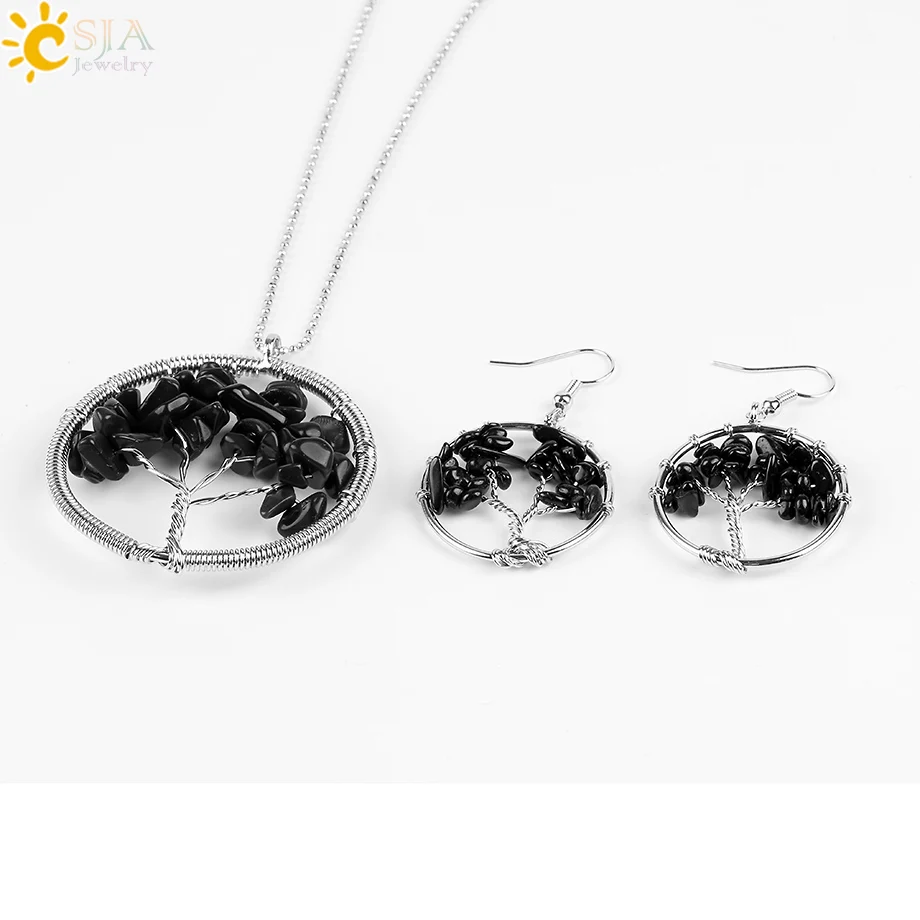 CSJA Reiki Ювелирные наборы Древо жизни натуральный драгоценный камень чипы оникс опал Кварц Камень Кристалл Серьги Подвески Исцеление E569