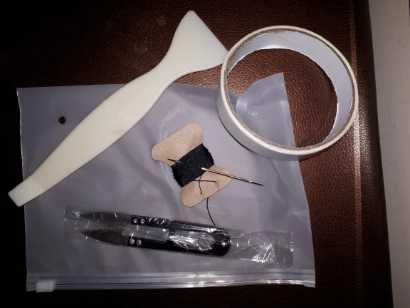 Великолепное качество, выглядит как натуральная кожа. В комплекте нитки, 2 иглы, ножницы, двусторонний скотч и лопатка. Рекомендую