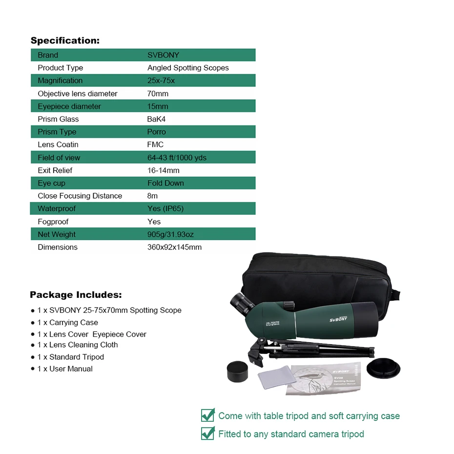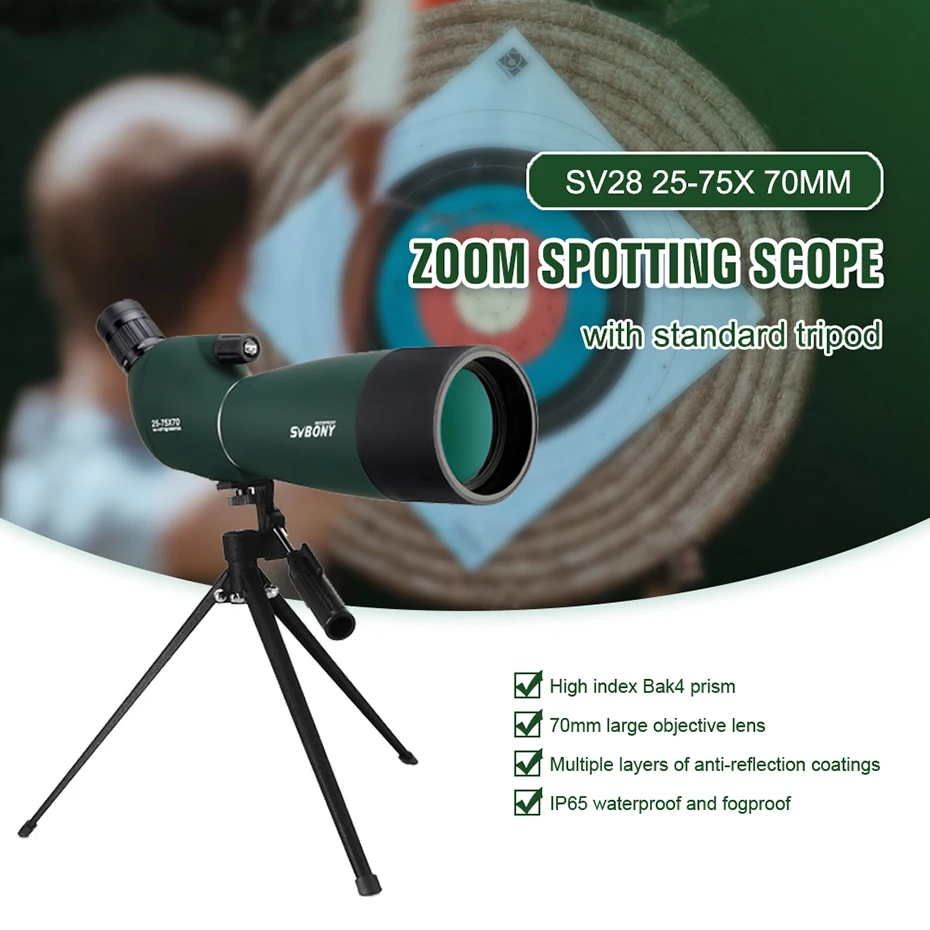 SVBONY SV28 25-75x70 подзорная труба монокуляр мощный Bak4-Призма FMC Водонепроницаемый с Триподом Лучший партнер для наблюдениястрельбы из лука на 50-100 метров