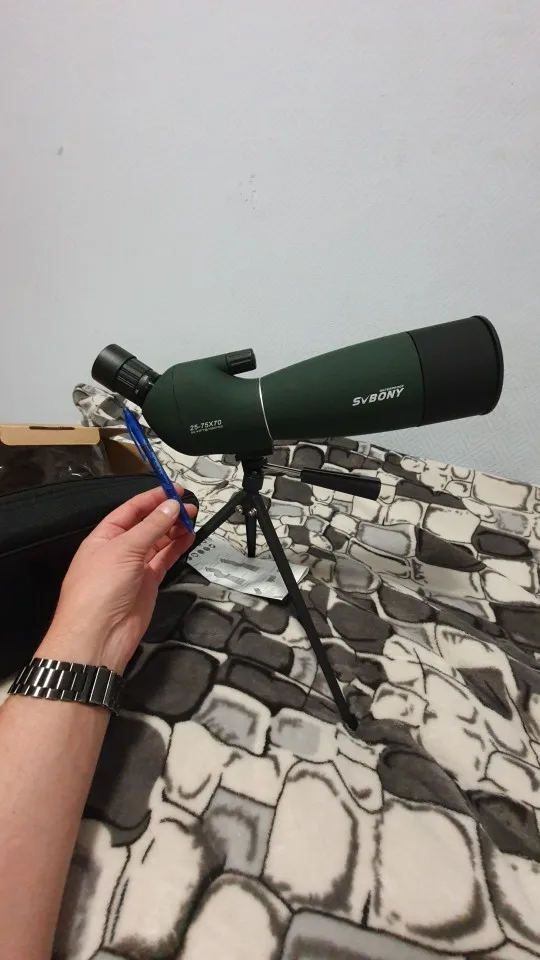 Товар получен. Качество ок. На максималке чутка темнит, но не критично. От тройки все ок. Пришёл быстро. В комплекте чехол для переноски, салфетка, линзы закрыты колпачками. Тринога из металла не люфтит, ножки с резиновыми оконечниками. Из минусов одно, большая линза была вкручена несоосно резьбе, что чуток слизала последнюю, но не критично. Брал для стрельбы, как проверю в "бою" дополню отзыв, что на вряд-ли конечно! Всем добра!