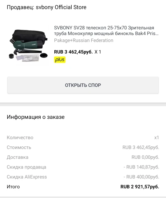 Заказал 17.10, в Нижегородскую область пришла 23.10. Качество супер. На ощупь очень приятная труба, по весу не тяжёлая, но и не супер лёгкая. В комплекте был штатив добротный, правда не высокий и тряпочка для протирки линз, ну и подсумок для всего этого. В общем я очень доволен. Со всеми скидками и октябрьским кэшбеком от карт МИР вышла в 2900р. За эти деньги супер. Жаль из-за погоды нет возможности пока смотреть никуда, но то, на что я смотрел, было видно отлично, на максимальной кратности при настройке фокуса почти нет размытостей изображения. На фото стоит увеличение 25х. Больше не было смысла ставить. Расстояние около 200 метров. В общем продавцу спасибо огромное и хороших продаж. Единственное, что я бы посоветовал - купите сразу высокий штатив и крепление под телефон для трубы. Все это можно найти на вайлдберрис или озон в пределах тысячи.