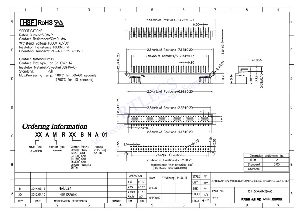 Разъем DIN 41612, 3 ряда, 30 позиций, гнездовые розетки, прямоугольный сквозной отверстие, шаг 3x10 контактов, 2,54 мм, 5 шт.
