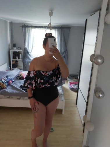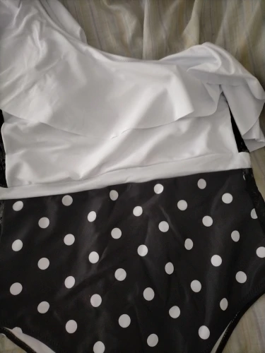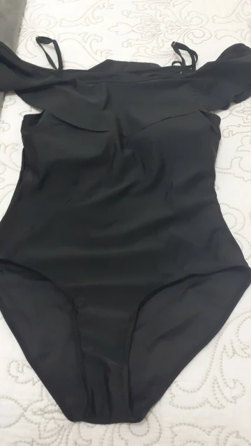 С размером угадала, красивый купальник. Передняя часть двойная, прячет и кубики и не кубики живота. Странная форма чашек делает грудь плоской, но из-за рюши это не особо видно. Пошит вроде не плохо, ниток торчащих - не критично, не много. Смотрится очень элегантно. Посмотрим, будет ли в нем удобно. В целом, я довольна покупкой. Интересная модель! Спасибо продавцу!