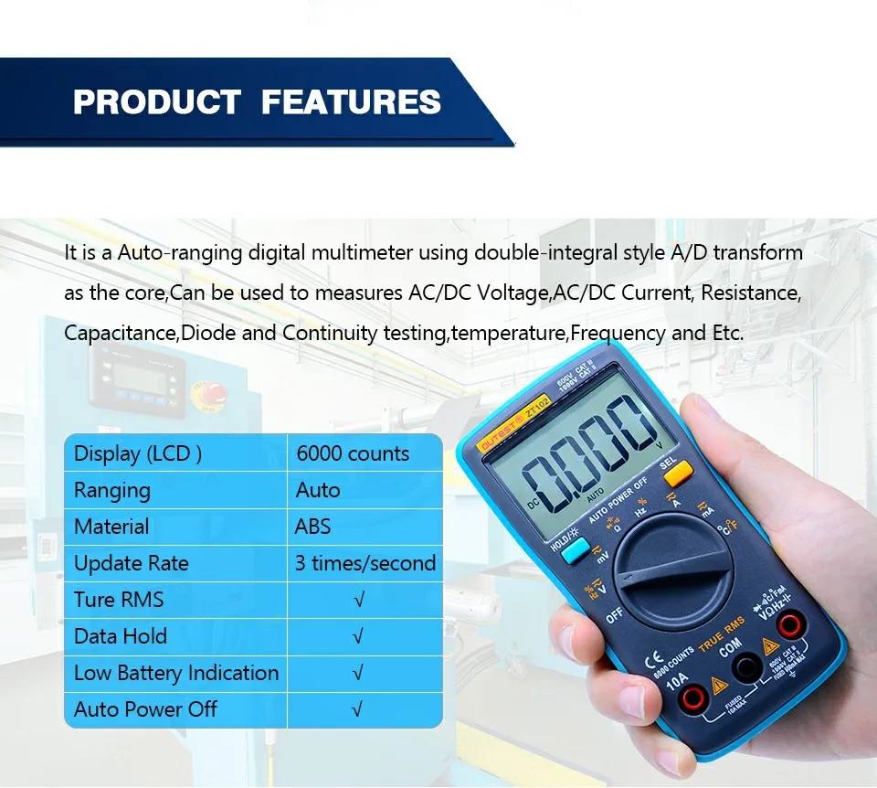 Основные измерения: напряжение переменного/постоянного тока, ток переменного/постоянного тока, сопротивление, емкость, Диод и Непрерывное тестирование, температура, частота и рабочий цикл.