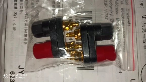 Приехало в общем мешке, но разные позиции упакованы отдельно. Очень качественная пара гнезд - сильноточная, соединение под пайку и зажим, внешнее - зажим или вилка. Случайное прикосновение к электропроводящим поверхностям - почти исключено. Рекомендую!