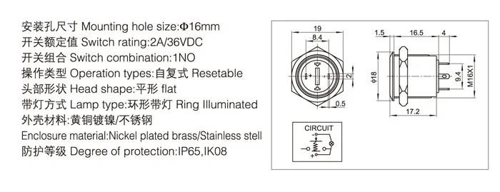 16 мм черный алюминиевый обычный Мгновенный кнопочный переключатель