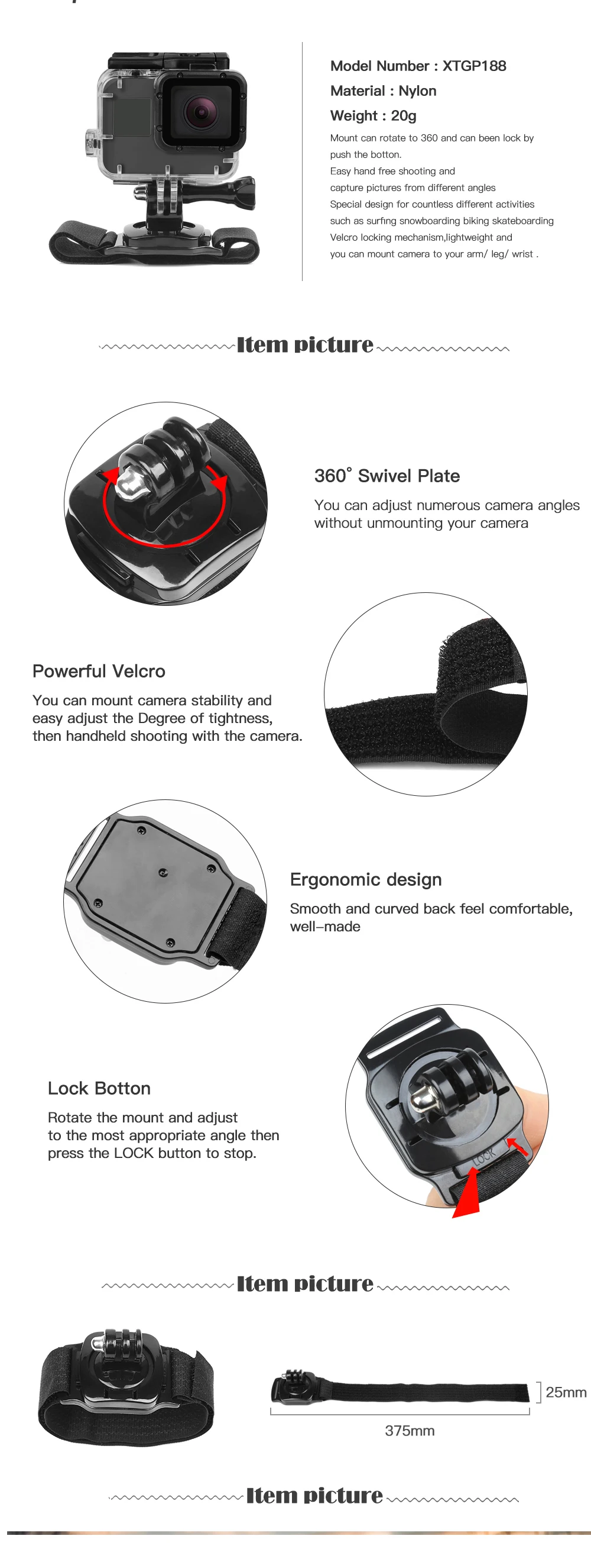 Крепление на запястье для Gopro Hero 7, 5, 6, 4 Session, Xiaomi Yi 4K, SJCAM SJ6, Eken h9, Go Pro, вращение на 360 градусов