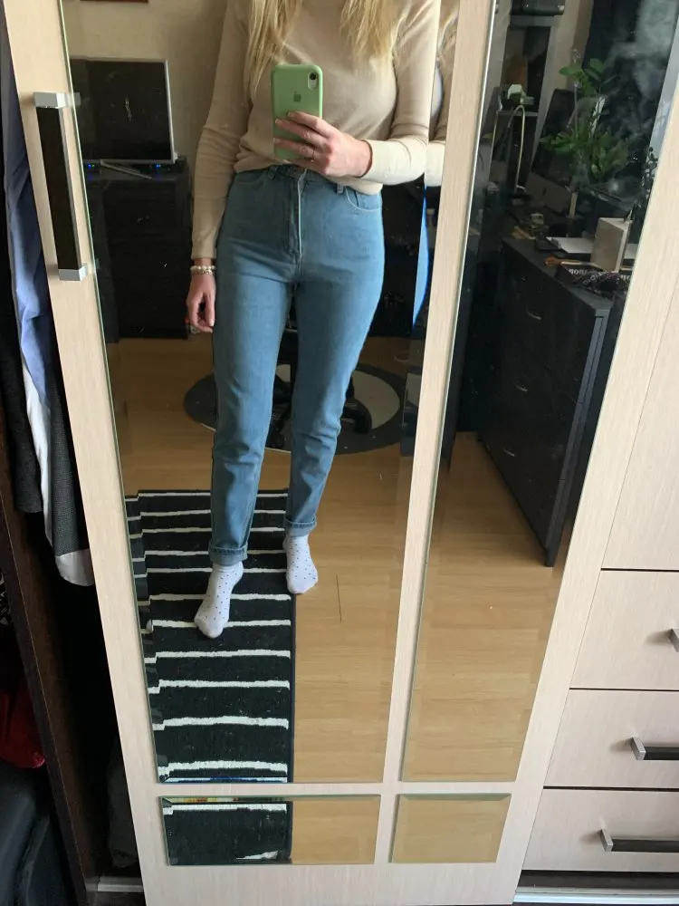 Джинсы очень хорошие. Плотная ткань. Красивый классический цвет. Высокая талия. И самое гоавное отличная длина. На рост 174 закрывает косточки. Рекомендую, особенно если вам не нравятся ужасные коротнкие джинсы подстрелыши.