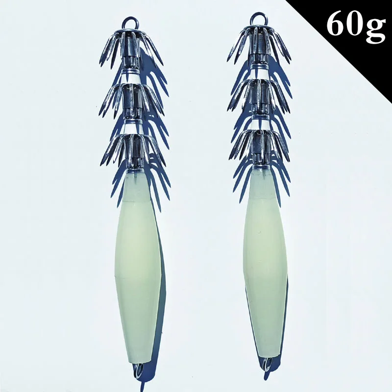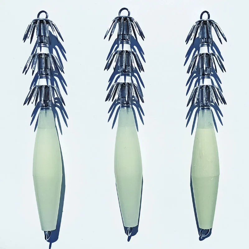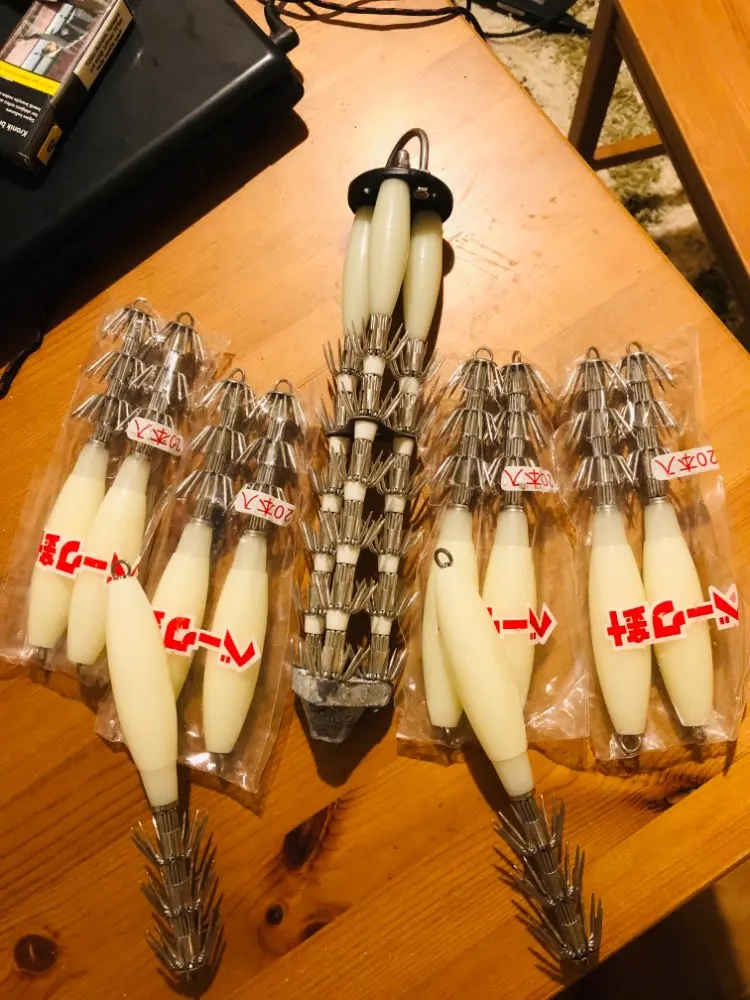 Красивые приманки для кальмаров. Может получить больший вес в следующий раз. Светящиеся очень хорошо и несколько крючков работают хорошо