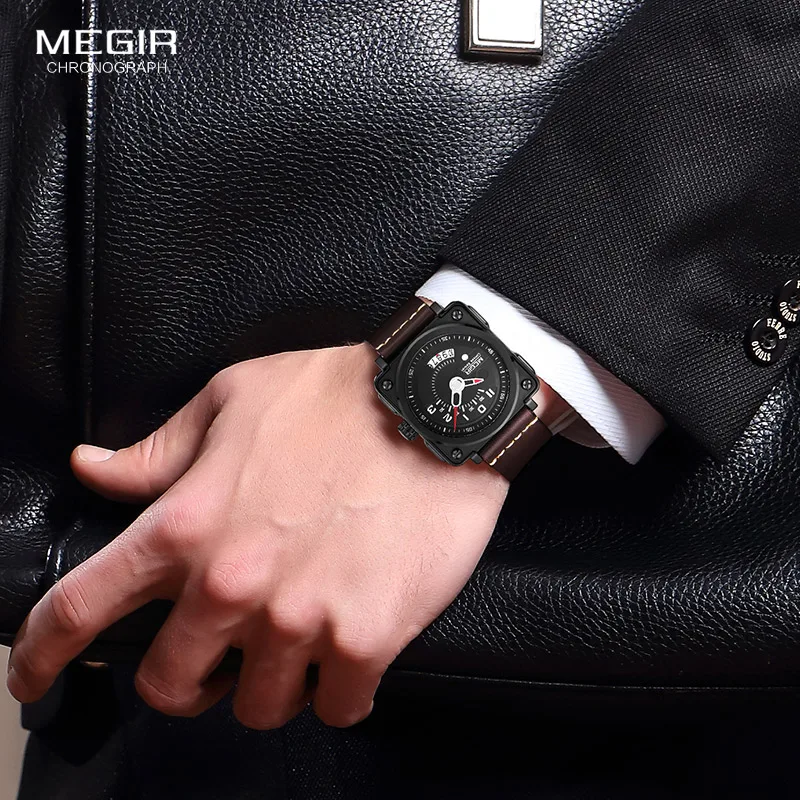 Часы наручные Megir Мужские кварцевые с квадратным аналоговым циферблатом, водонепроницаемые, с кожаным ремешком, с календарем и датой, 2040