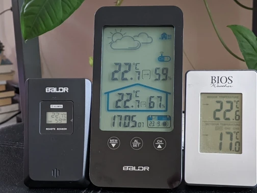 Плохое качество. Экран не полностью прикреплен, поэтому он скользит вокруг. Гремит при встряхивании. Трудно читать дисплей, потому что он наклоняется назад. Справа мой биотрометр, который у меня был в течение 10 лет. Лучшее качество, но нет датчика влажности, поэтому я получил этот, но датчик влажности выключен! Он читает 10% различных, несмотря на датчик и дисплей находится рядом друг с другом. Температура тоже не всегда одинаковая