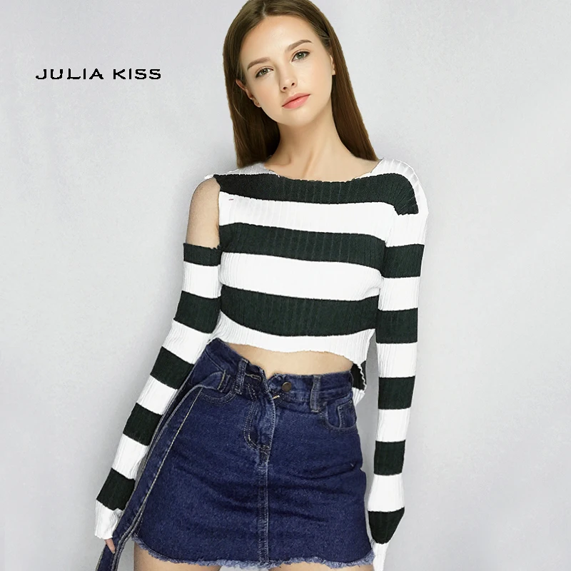 Женский полосатый Укороченный трикотажный топ с одним плечом и длинным рукавом, полосатый укороченный свитер, пуловеры