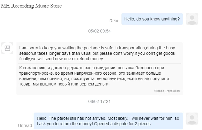 Прошли сроки доставки, ничего не приехало. Продавец не хотел возвращать деньги 2 недели. Потом деньги поступили на счёт.