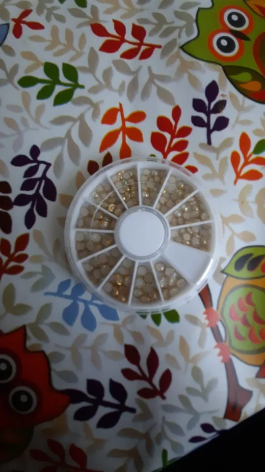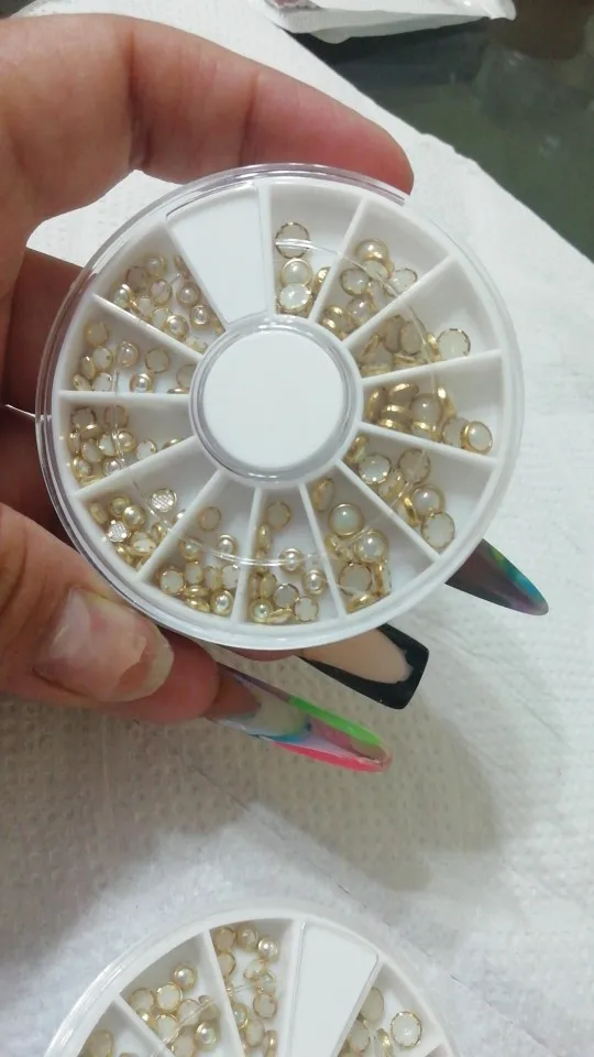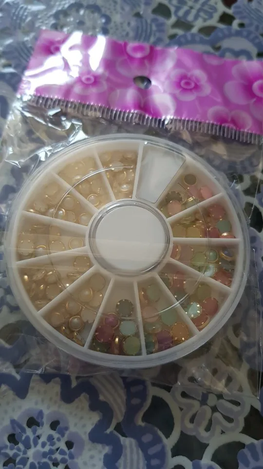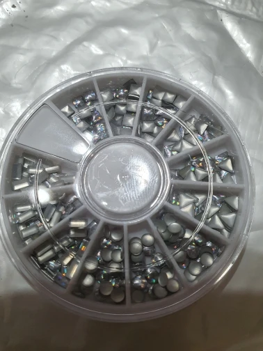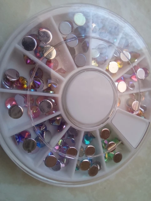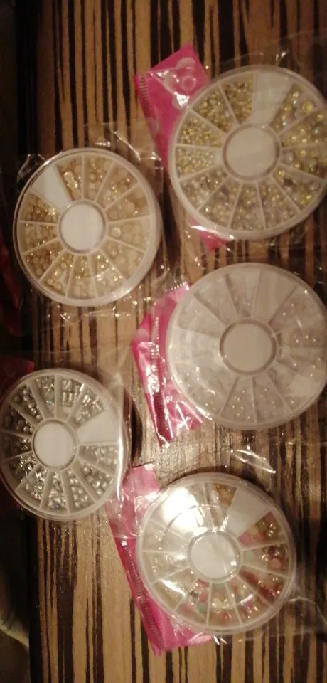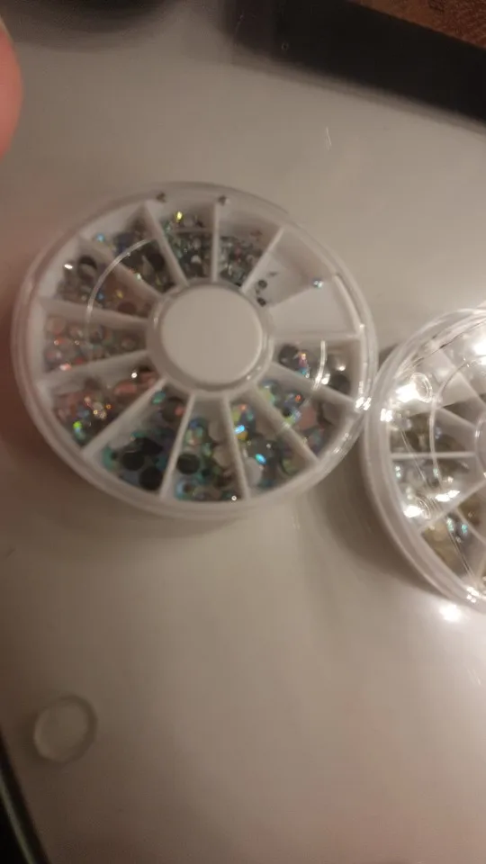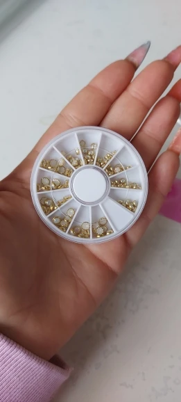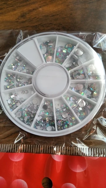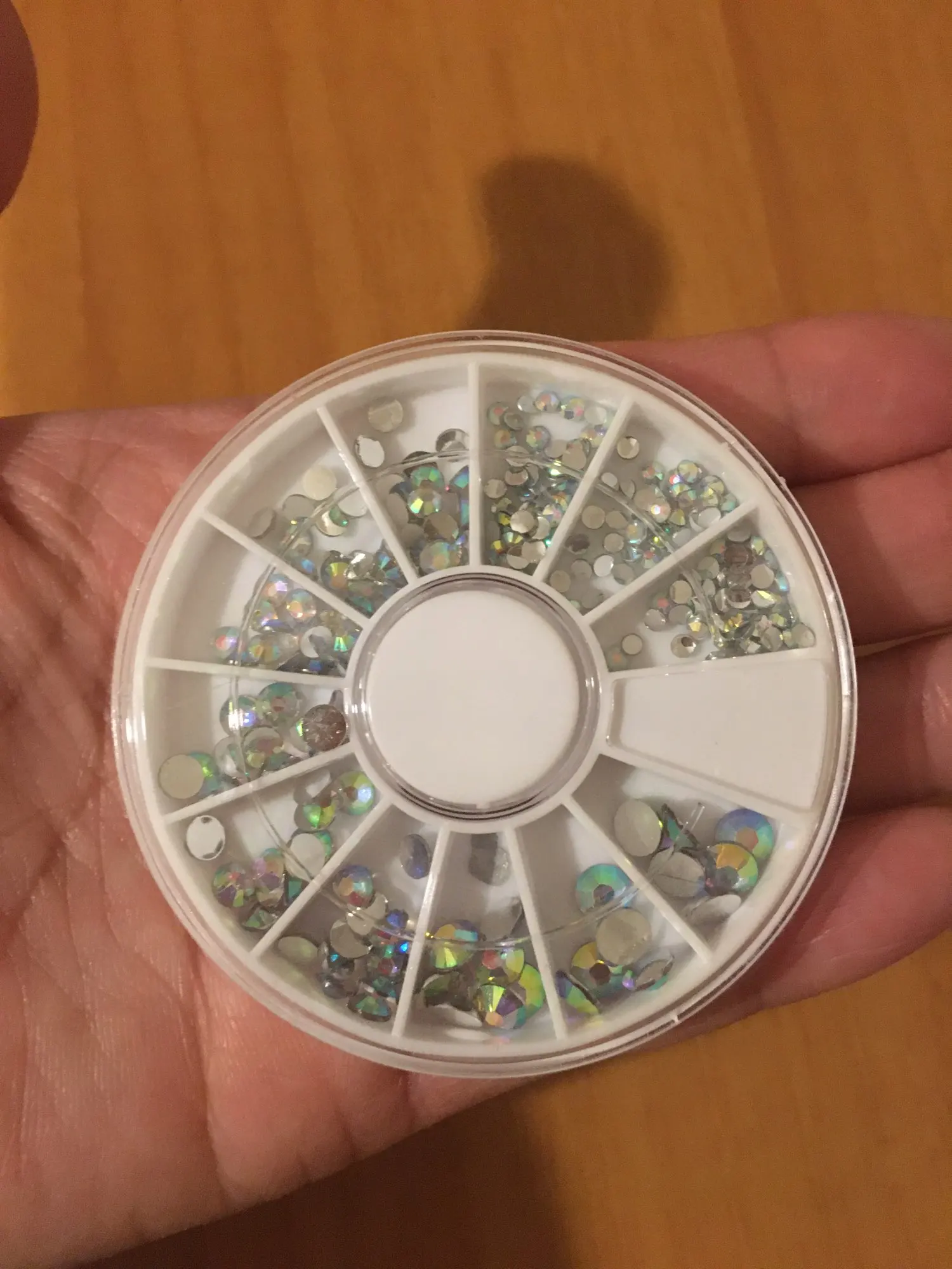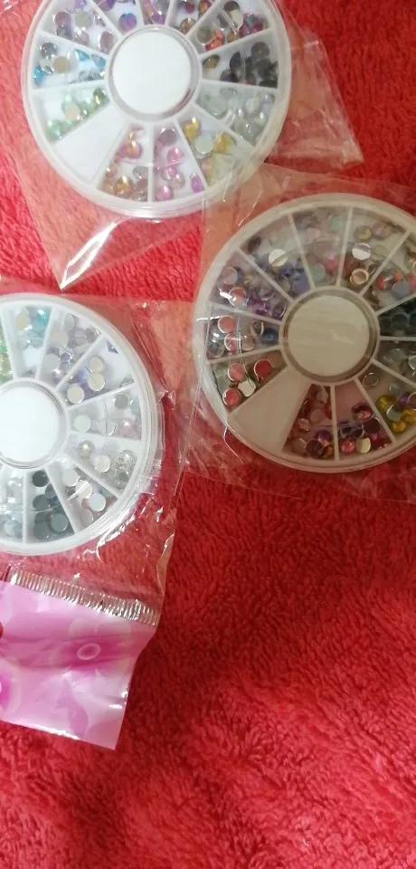 товар шёл очень долго, два с половиной месяца, но стразы очень красивые, переливаются всеми цветами радуги, разных размеров, в отсеках их достаточно, стеклянные, на фото на ладони два размера, самый большой и самый маленький, есть ещё два вида средних, рекомендую, смотрятся дорого
