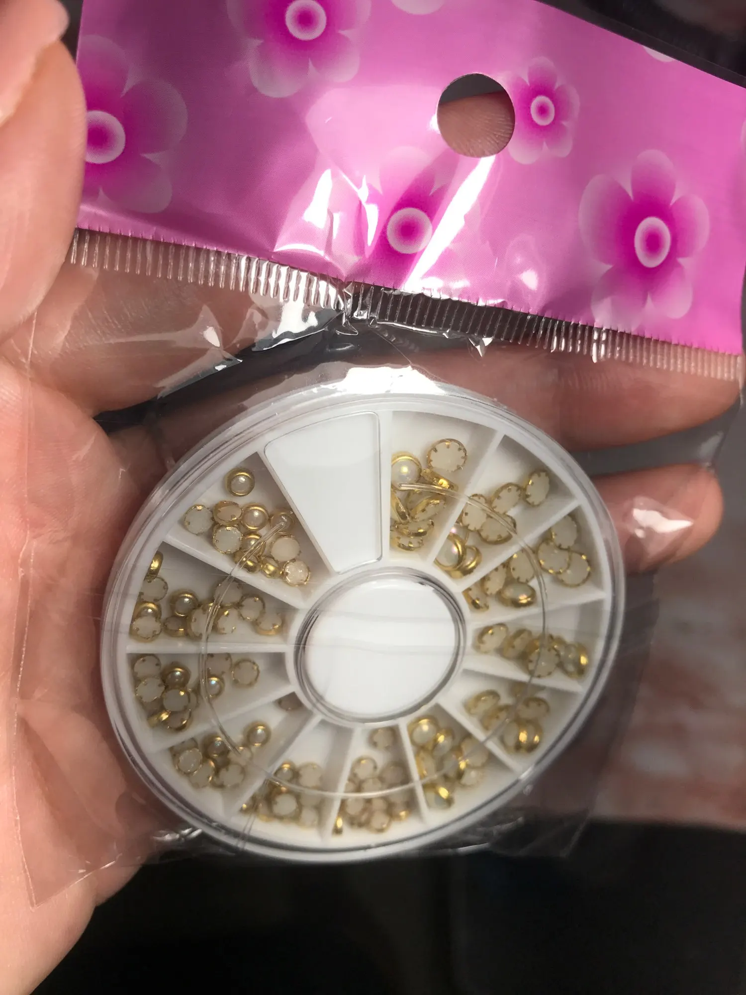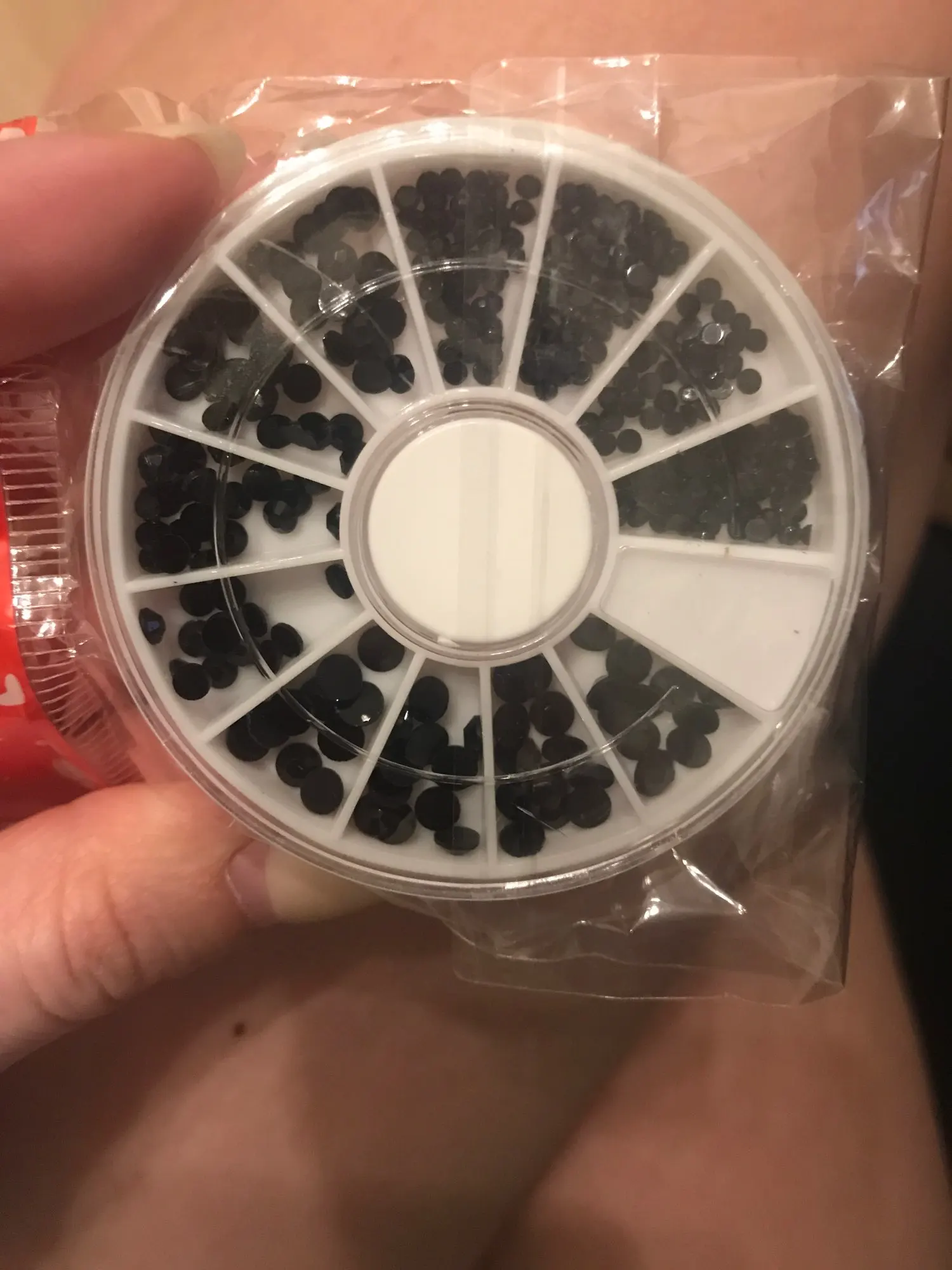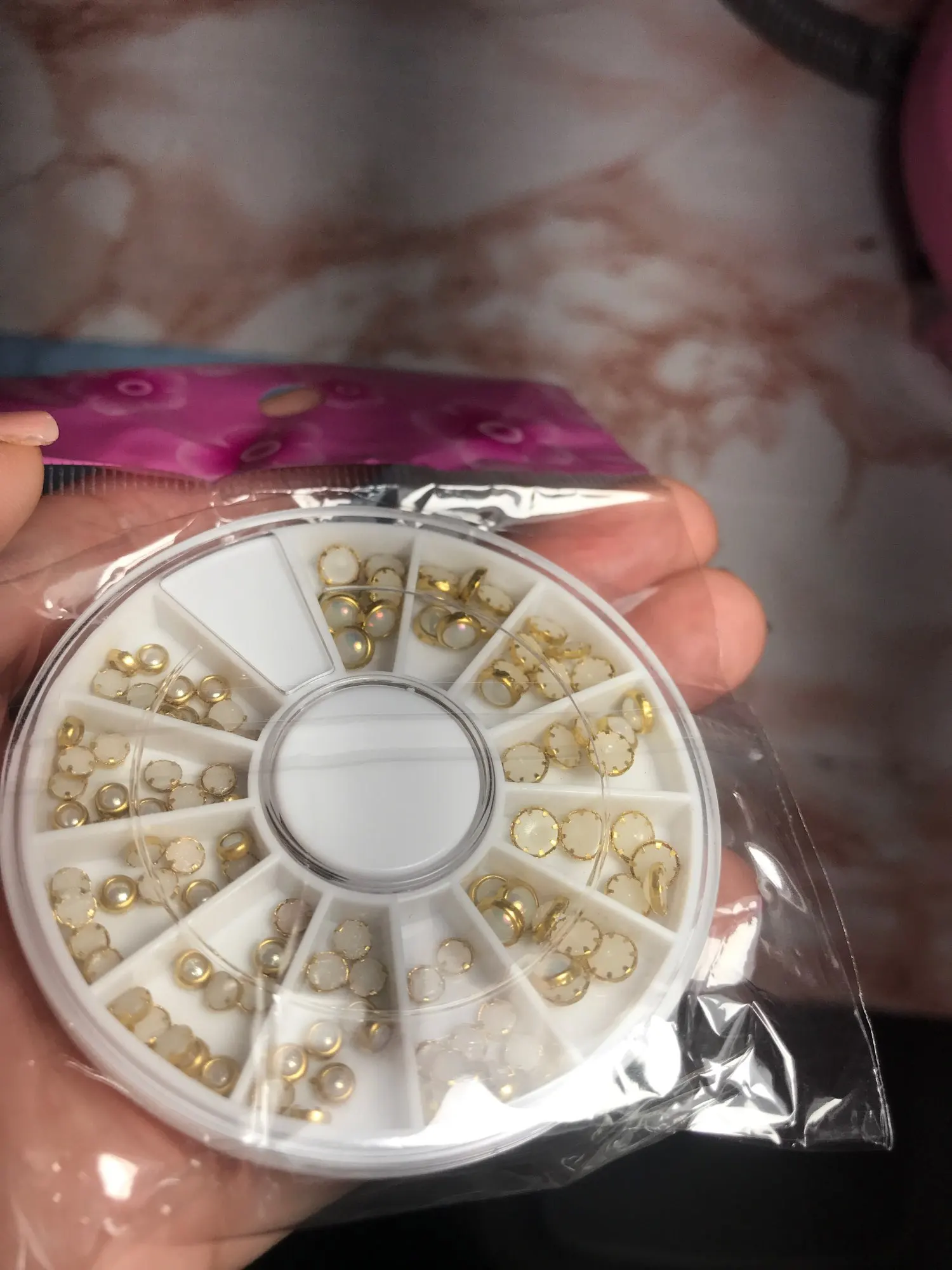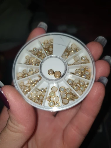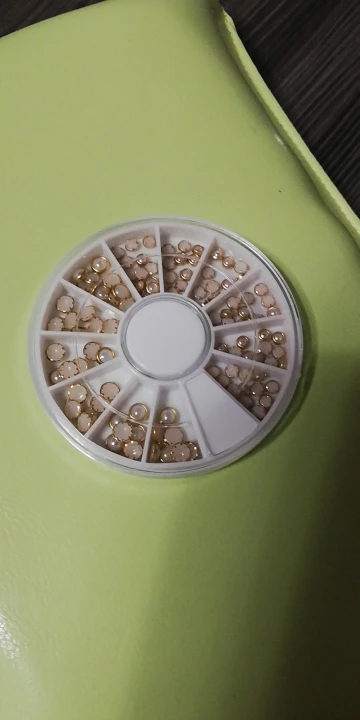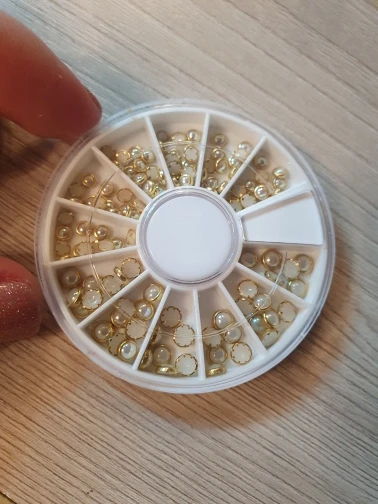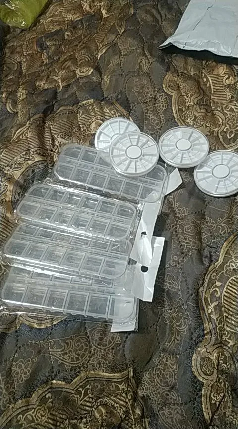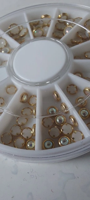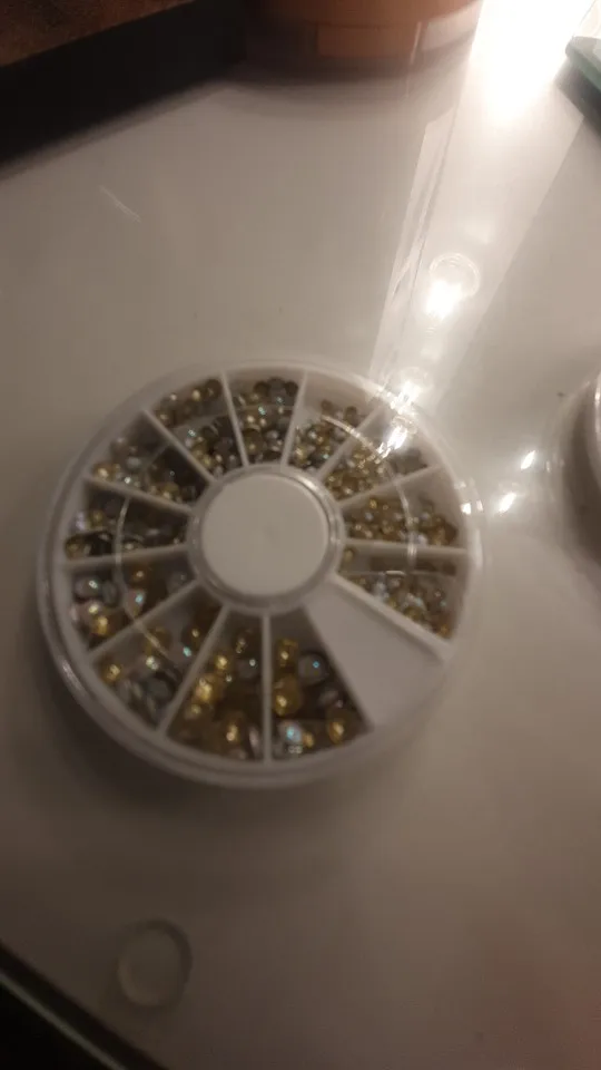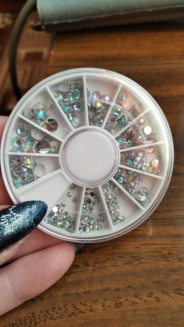 товар шёл очень долго, два с половиной месяца, но стразы очень красивые, переливаются всеми цветами радуги, разных размеров, в отсеках их достаточно, стеклянные, на фото на ладони два размера, самый большой и самый маленький, есть ещё два вида средних, рекомендую, смотрятся дорого
