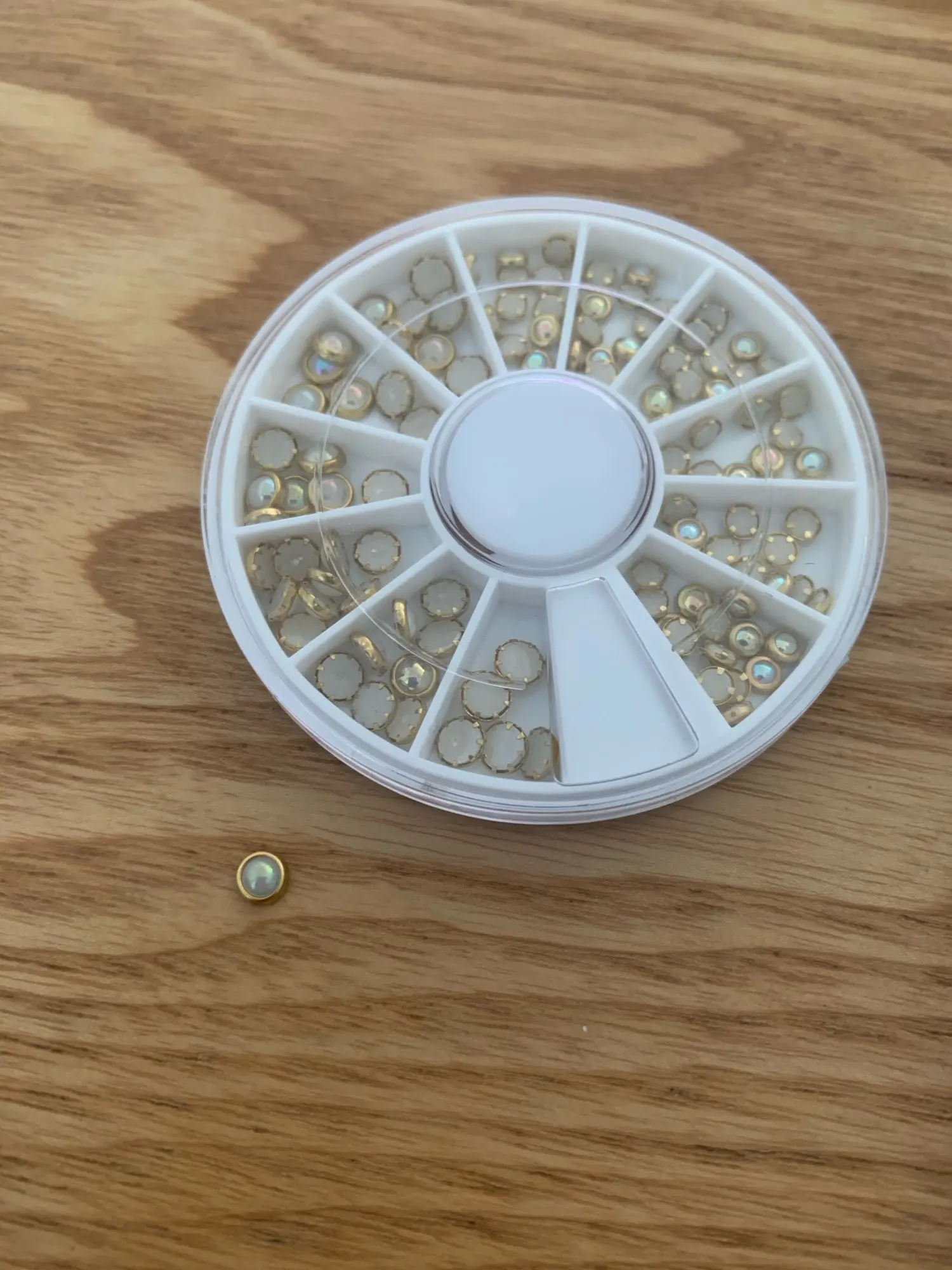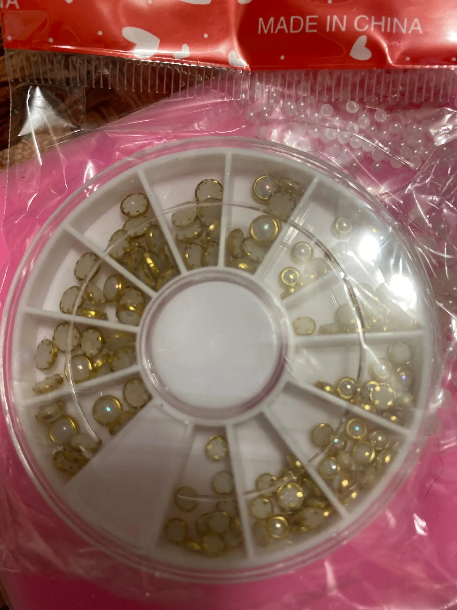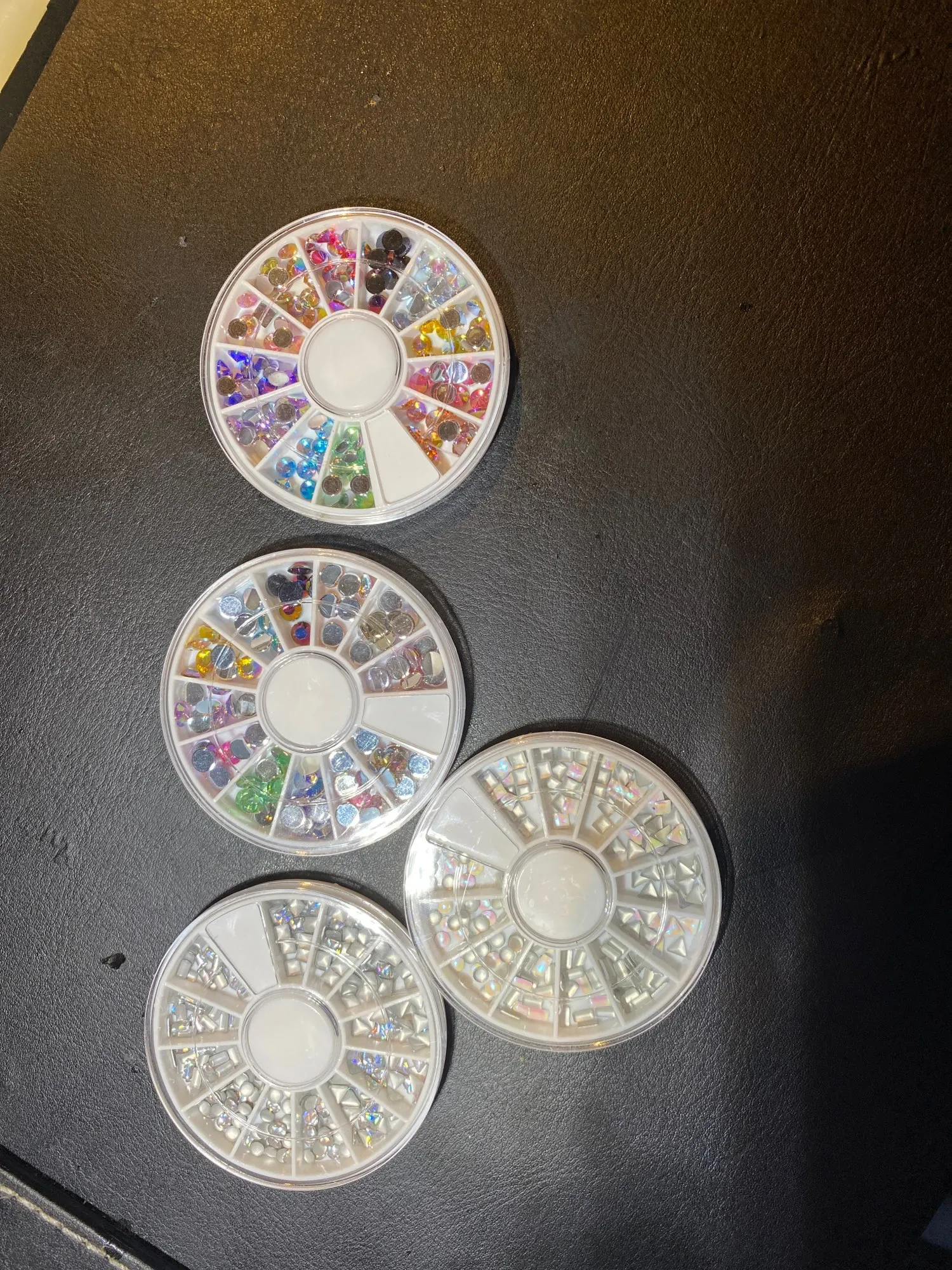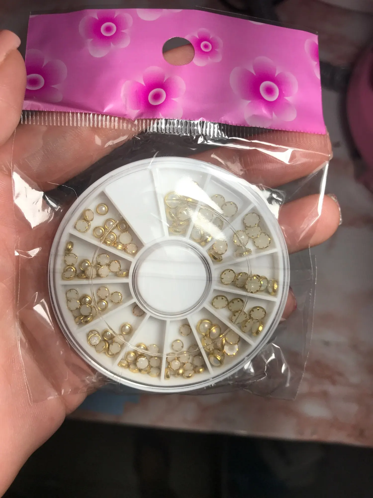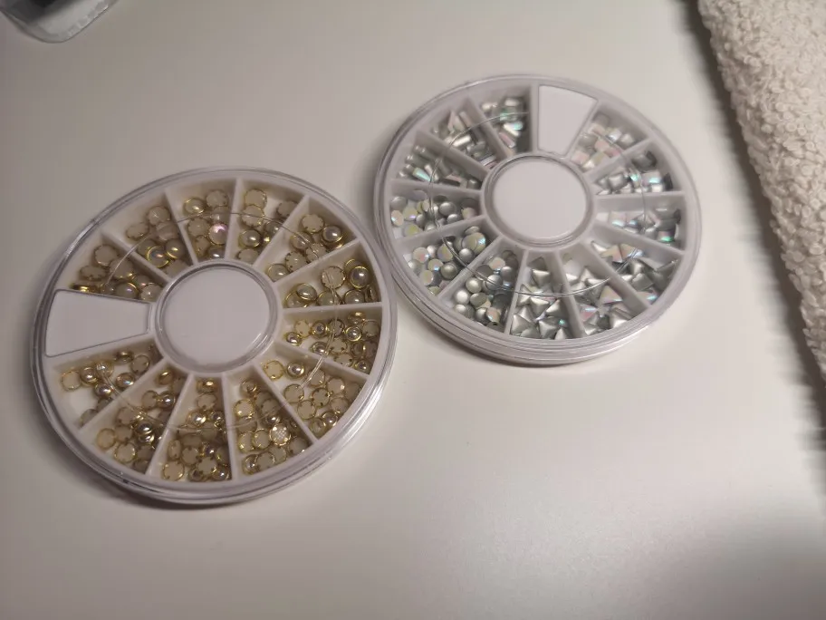товар шёл очень долго, два с половиной месяца, но стразы очень красивые, переливаются всеми цветами радуги, разных размеров, в отсеках их достаточно, стеклянные, на фото на ладони два размера, самый большой и самый маленький, есть ещё два вида средних, рекомендую, смотрятся дорого