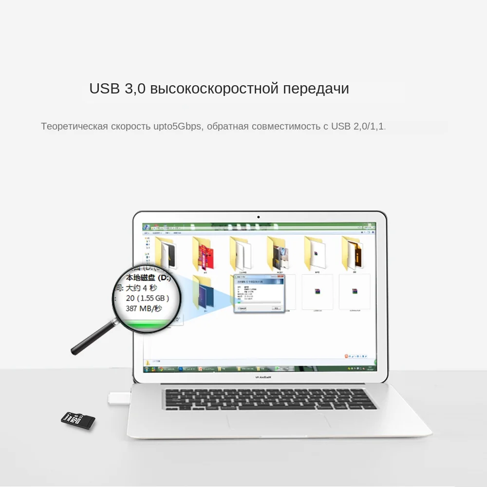 Отличный картридер. Маленький как обычная флешка. USB 3.0 - быстрая скорость чтения и записи. Светодиодный индикатор работы синего цвета. Крышка с защелкой.