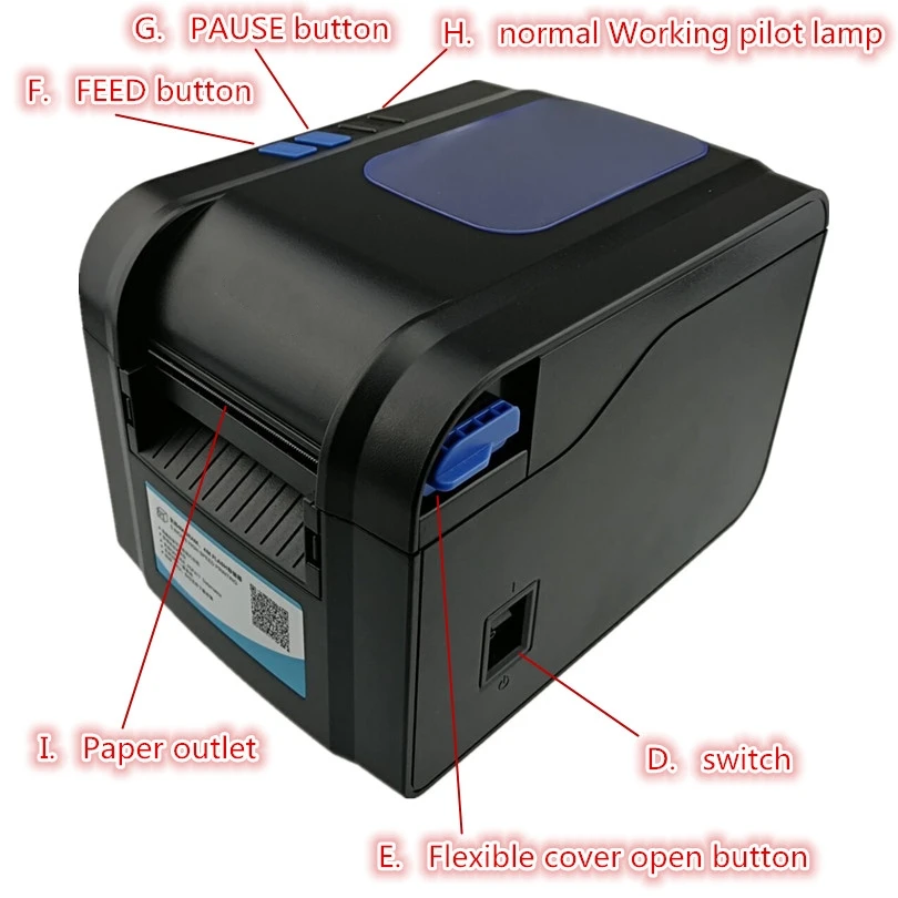 D. Переключатель E. Гибкая крышка открытая Кнопка F. Кнопка подачи G. Кнопка паузы H. Нормальная рабочая Пилотная лампа I. Бумажная розетка