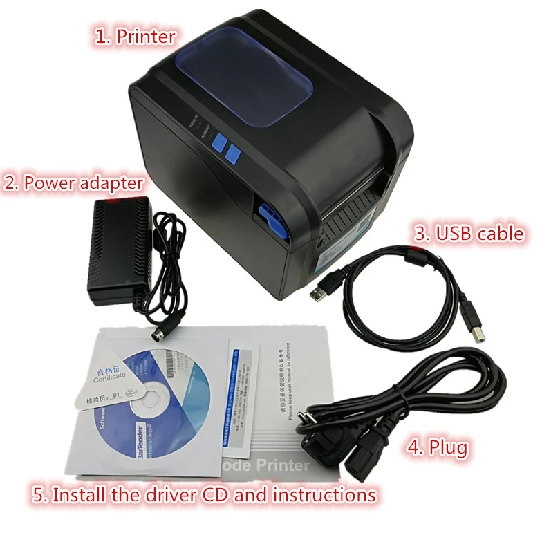 1. Принтер 2. Адаптер питания 3. Usb-кабель 4. Штекер 5. Установка компакт-диска драйвера и инструкции