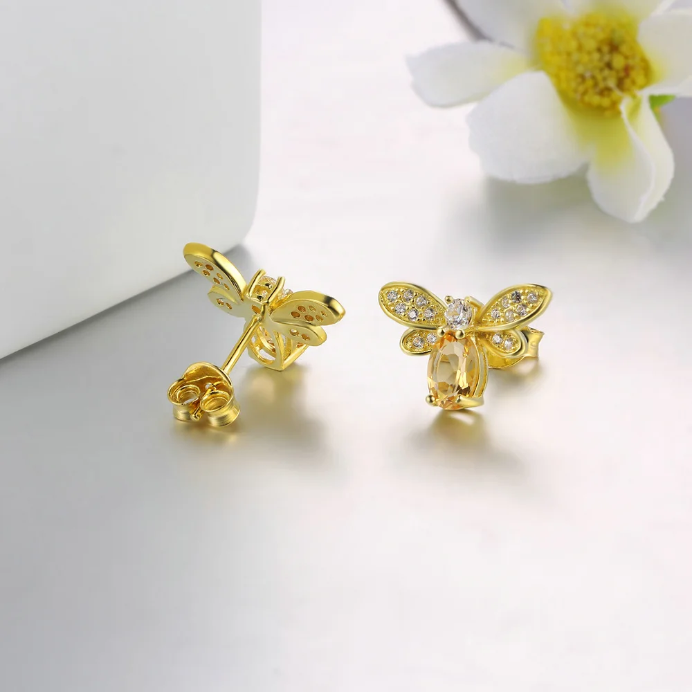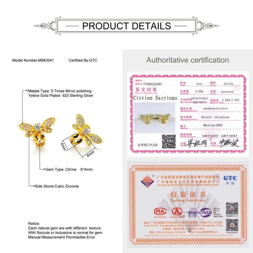 Женские серьги MoBuy MBEI041, из серебра гвоздики Пчелка пробы, с натуральным цитрином, ювелирные украшения с покрытием из желтого золота 14 к, ювелирные украшения для женщин