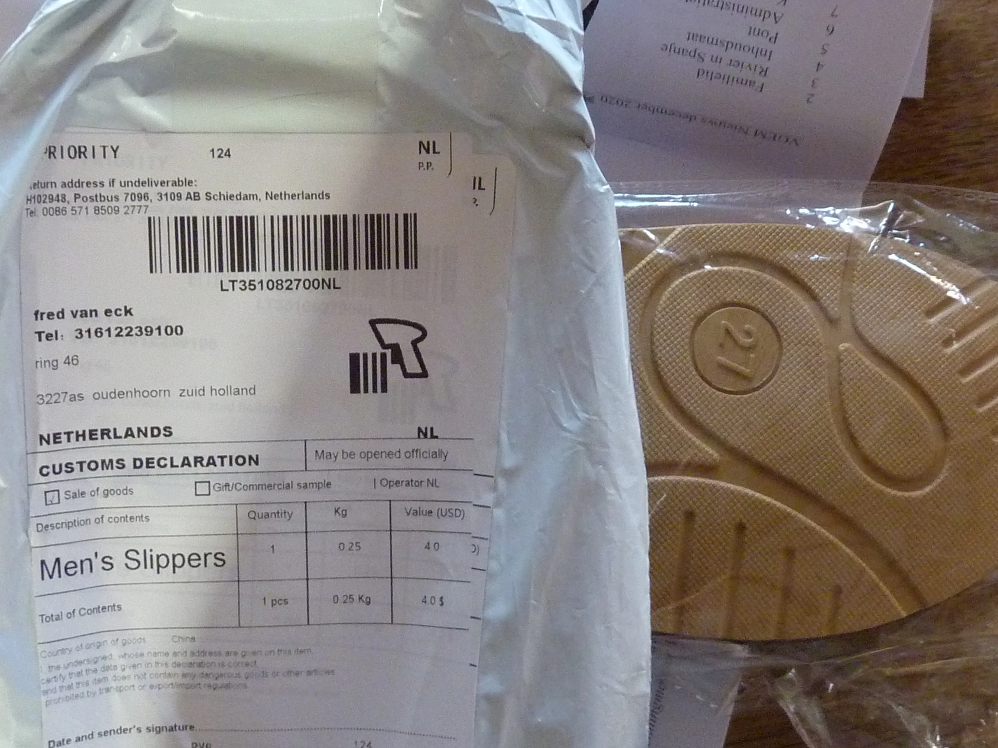 Тапки очень хорошие. Не скользят. Удобные. Не прошитые, как ожидалось, а клееные, но не страшно. Трек отслеживался из Китая до почты. Доставили довольно быстро. Все хорошо.