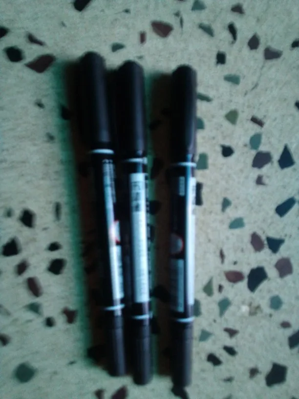 Пришли черные маркеры, напомню синими был крайне не доволен, уже было пожалел, что и черные тут же заказал. Но черными я доволен. Протестил на чашке, пластике, стекле и металле все шесть маркеров. Черный довольно плотно рисует, а синий нет - это хорошо видно на стекле. Через 1-2 минуты пытался стереть сухим пальцем, ничего не стерлось, но палец немного посинел. Спонжем с водой стирался синий маркер, быстрее всего с чашки и почти не стерся с металла. Черный только на пластике немного поддался. Ну и очистить все это пришлось спонжем со спиртом, причем синий стирался с одного проведения, а черный еще несколько раз надо было провести.