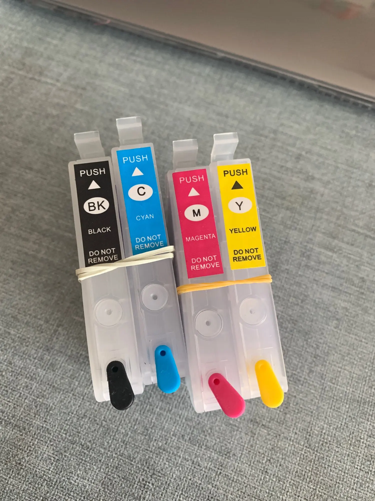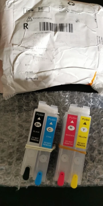 Выглядит хорошо. Во-первых, небольшое недоразумение, вы должны удалить цветные каучуки, когда вы положите его в принтер, в противном случае он не подойдет, и держатель картриджа будет блокировать и вызвать сбой сканера. RTFM!