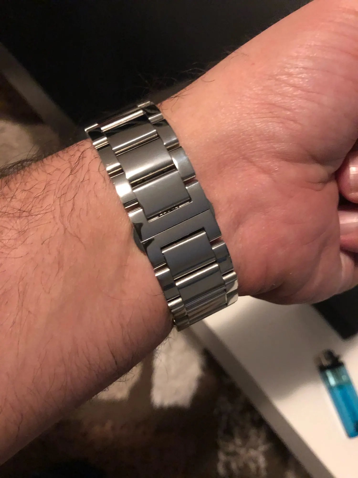 Браслет хорошего качества. Доставка быстрая. Звенья очень хорошо отполированы, в комплекте 4 пина для крепления браслета, и специнструмент для снятия лишних звеньев. Потратил 5 минут чтоб отрегулировать размер под свою руку. Спасибо продавцу, очень рекомендую к покупке.