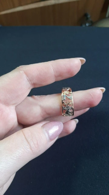 Очень интересный дизайн.Колечко под золото.Аккуратное,изящное,хорошо смотрится на пальчике.В подарочной упаковке.Я очень довольна.Спасибо всем службам.Прекрасная работа.Рекомендую.