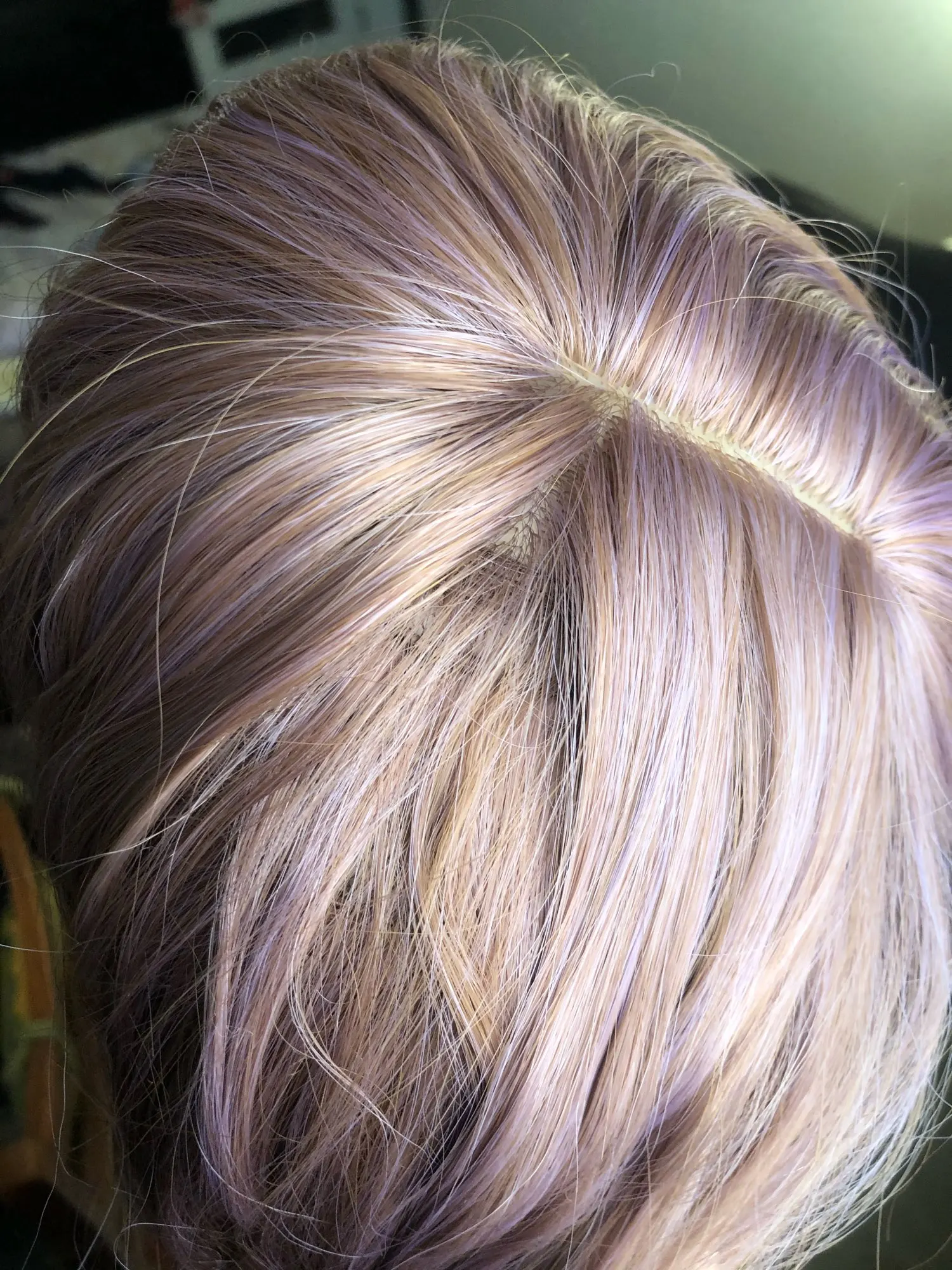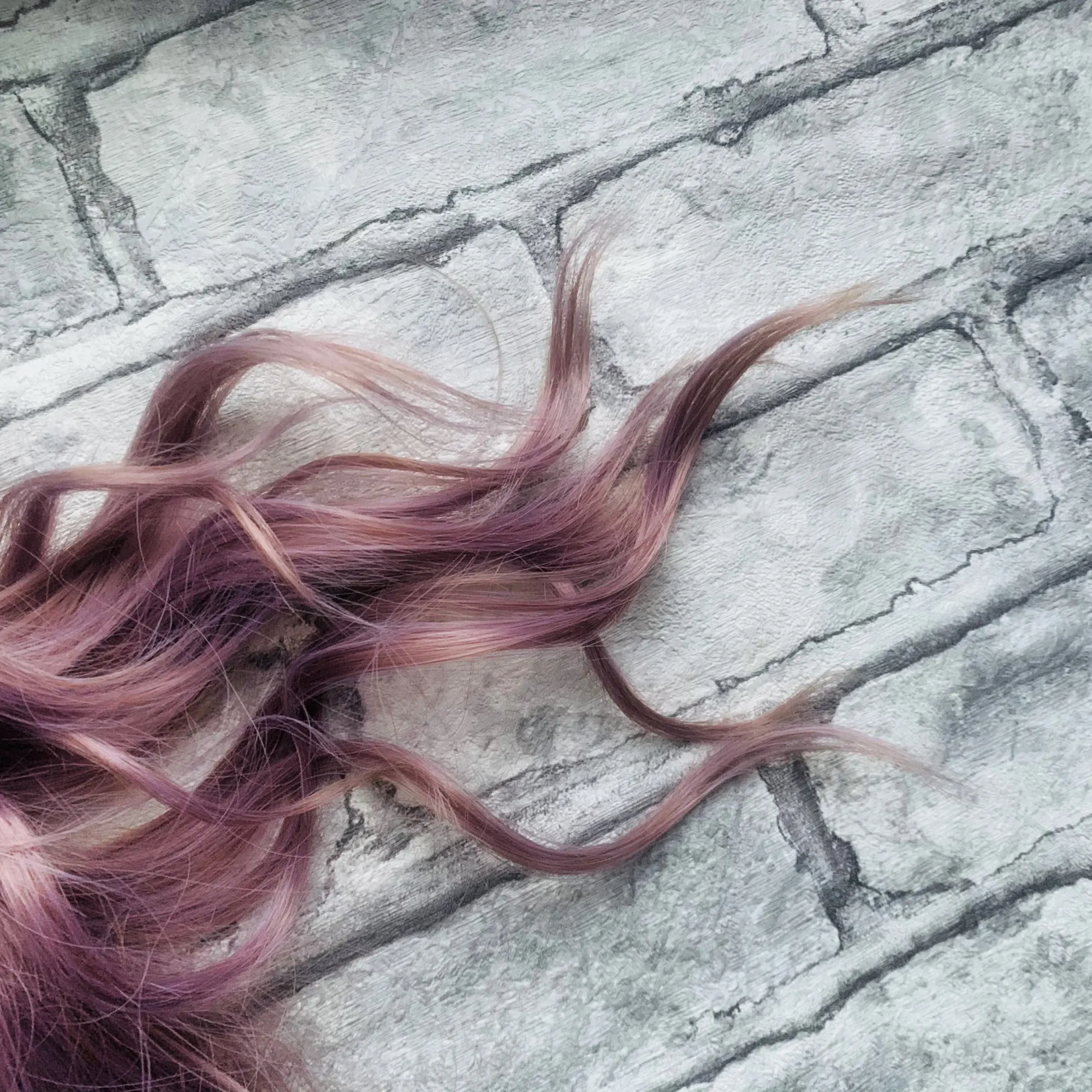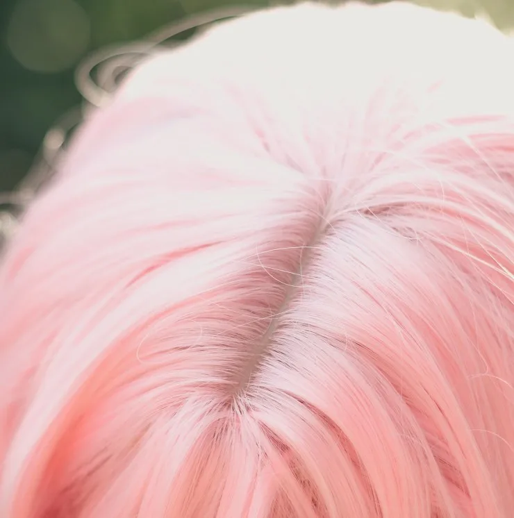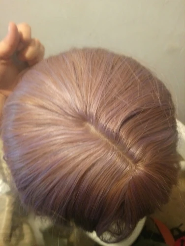 парик очень жидкий, но он брался для фотографий, так что все в порядке. мягкие волосы, хорошо расчесываются, перламутрово-розового оттенка, светлый цвет.