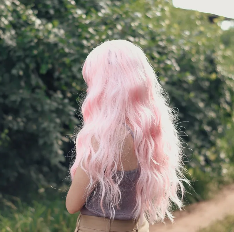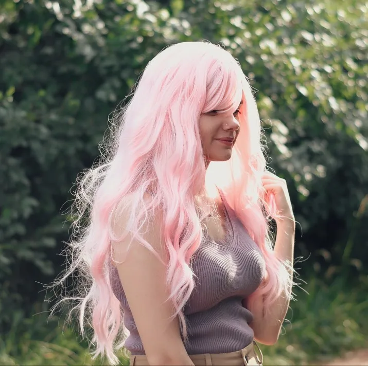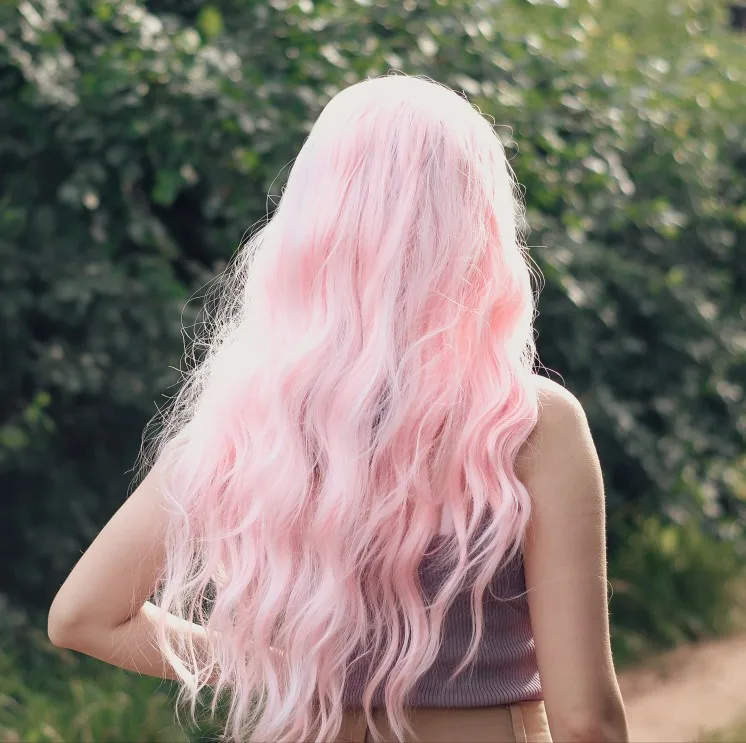 Прикольный парик, не путается, хотя и волнистый. Челка длинная, стричь под себя придется самим, но там ничего сложного. Цвет нежно-розовый. Брала для косплеев. Волосы очень длинные, парик регулируется по голове без проблем. В подарок сетка и переводные тату, очень мило^_^