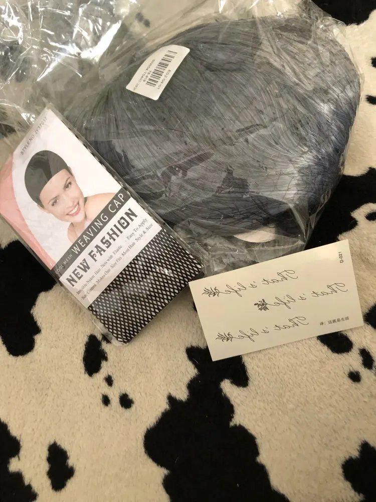 Весьма приятная покупка. Искусственные волосы очень мягкие, приятные на ощупь и легко расчёсываются; выпадают не больше, чем у прочих париков. Прошивка у него не слишком густая, но это не критично. Парик совсем не давит и не ощущается почти на голове. В посылке также было целых три подарка: шапочка, чтобы убрать свои волосы, переводная тату и чокер.