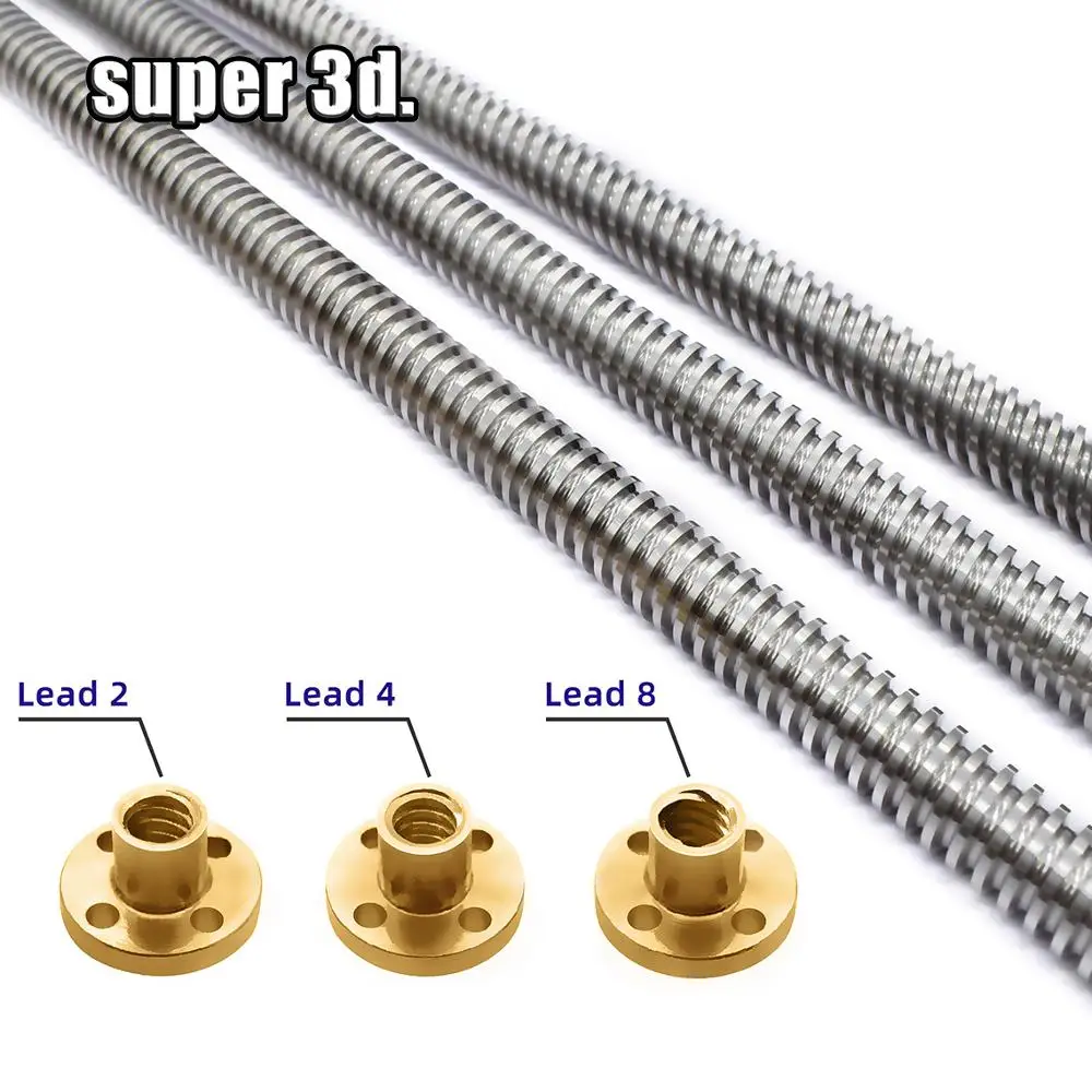 Свинцовый стержень T8, диаметр 8 мм, шаг 2 мм, свинцовый стержень 2 мм, Длина 150-750 мм, резьбовые стержни с латунной гайкой для 3D-принтера Reprap
