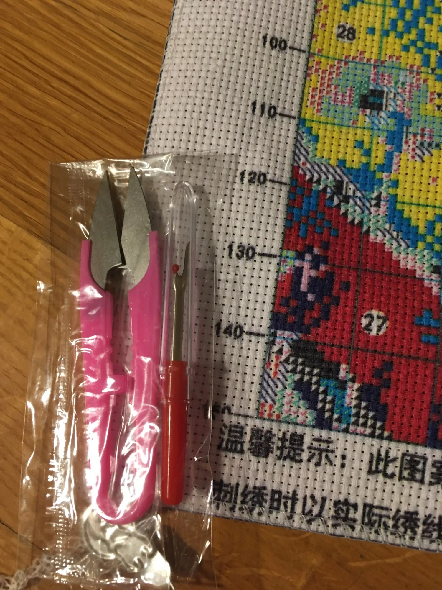 Посылку ждала 1,5 месяца, получила в магазине "Пятерочка". Канва плотная с прошитым краем и нанесенным рисунком. В комплекте 5 иголок, распошиватель, нитковдеватель и ножнички. Схема напечатана на отдельном листе с двух сторон. Нитки шелковые заказала.