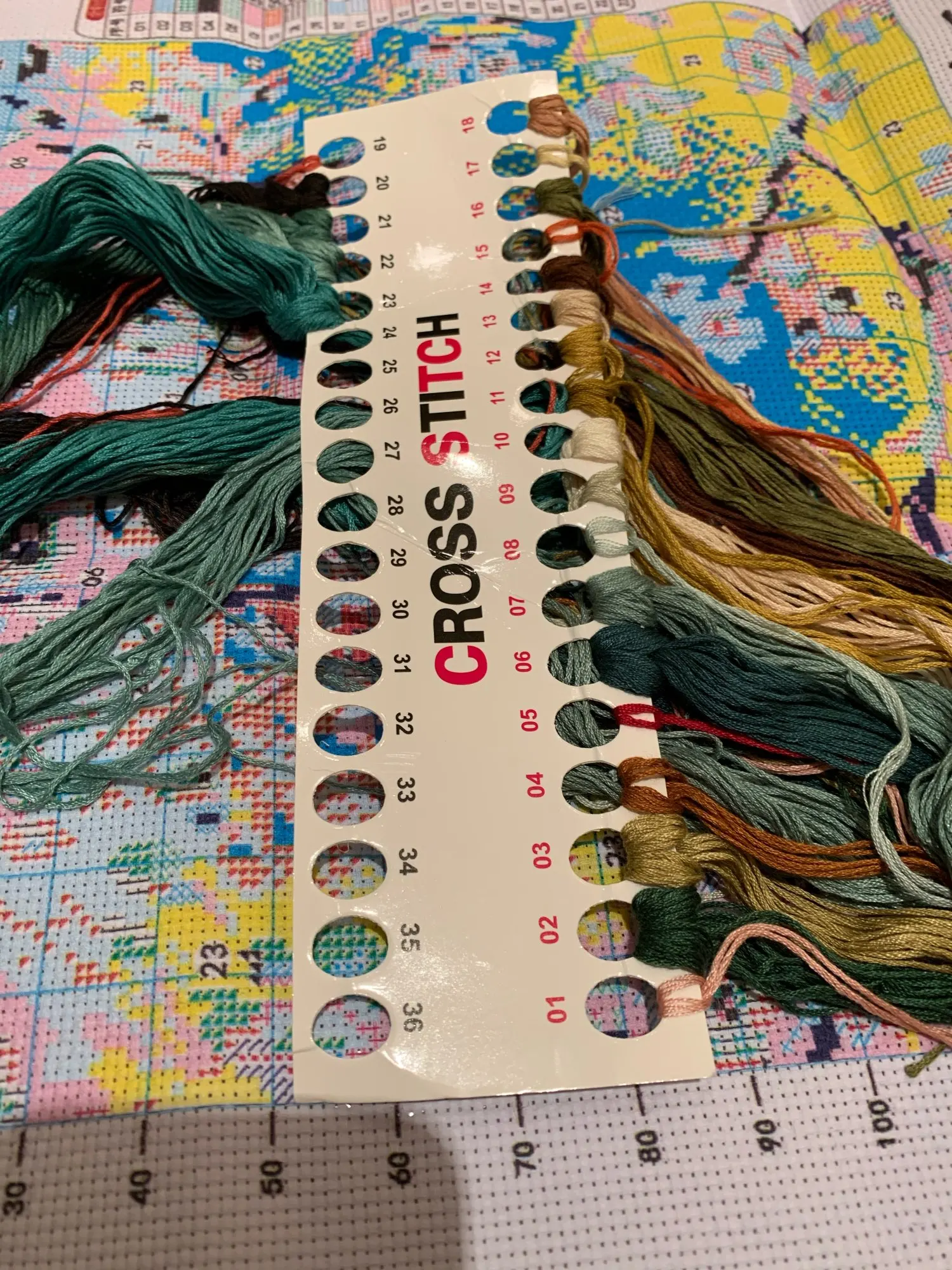 Отлично, быстро. Канва с рисунком, 24 цвета, отличный подарочек от продавца. Цвет основной все оттенки бирюзы. Очень красиво, не знаю кто увидел зелёный, меня это останавливало. Цвета как на картинке. Жду не дождусь приступить, но нужно закончить предыдущую.