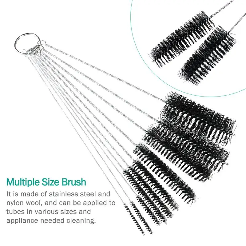 Описание Этот продукт содержит 1 набор из 10 кистей с различными диаметрами. Диаметр этих 10 кистей составляет 2, 3, 4, 5, 6, 8, 12, 16, 20 и 24 мм (1/16, 1/9, 1/6, 1/5, 1/4, 1/3, 1/2, 2/3, 3/4 и 1 дюйм). Все кисти длиной 8 дюймов, безопасны в посудомоечной машине и изготовлены из нержавеющей стали и нейлоновой щетиной. Каждый набор из 10 кистей поставляется со съемным кольцом для ключей для быстрого и легкого доступа. Все кисти имеют удобную петлю в конце ручки, чтобы повесить, когда они не используются, или повторно прикрепить к кольцу для безопасного хранения. И каждый конец кисти имеет консервативный дизайн, который обеспечивает вам большую безопасность. Особенности -Цвет: как на изображении.-Материал: нержавеющая сталь, нейлон.-Размер: около 20*5*1 см.-Подходит для всех видов очистки слепых углов: набор кистей состоит из 10 нейлоновых трубок, различных диаметров от 1/16 дюйма до 1 дюйма, вы всегда можете найти подходящий инструмент при очистке зазоров, места мертвых углов. Легко попасть в труднодоступные места, и больше не остается пыли в вашей жизни.-Подходящая твердость: кисти поставляются со съемным кольцом для ключей и соответствующей твердостью. Не беспокойтесь о том, чтобы поцарапать ваши предметы при уборке, такие как очки, ювелирные изделия, сотовые телефоны и т. д.-Защитный дизайн: каждый конец кисти имеет консервативный дизайн. Не только предотвращает царапины, но и защищает вас от вреда при чистке.-Безопасность в посудомоечной машине: изготовлена из нержавеющей стали и нейлоновой щетины, безопасна для мытья посуды и питья соломинкой. Хорошо изготовленные нейлоновые щетинки также не легко выщипывать.-Также идеально подходит для воздушных кистей, небольших бутылок, карбюраторов, сотовых телефонов, коландрий, питьевой соломинки, капельных наконечников, Эспрессо-машин, глазных стекол, стеклянных капель и бутылок капельницы и т. д. Упаковочный лист