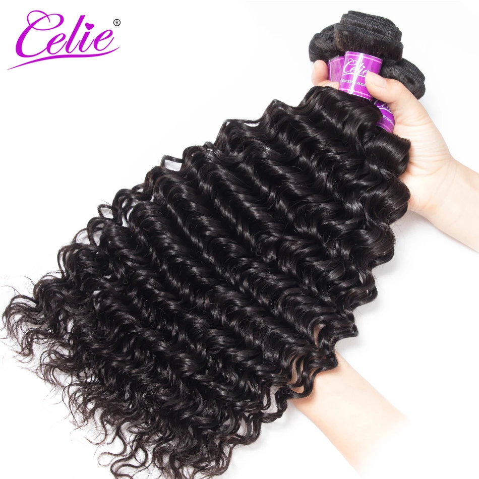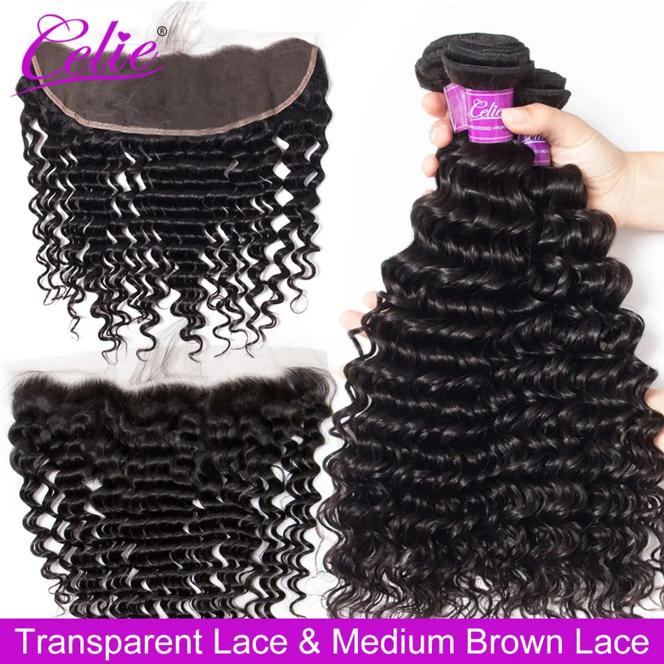 Celie пучки глубокой волны с фронтальной Remy бразильские вьющиеся пучки с HD прозрачным закрытием человеческие волосы 3 пучка с закрытием
