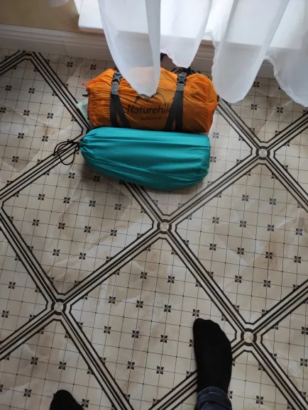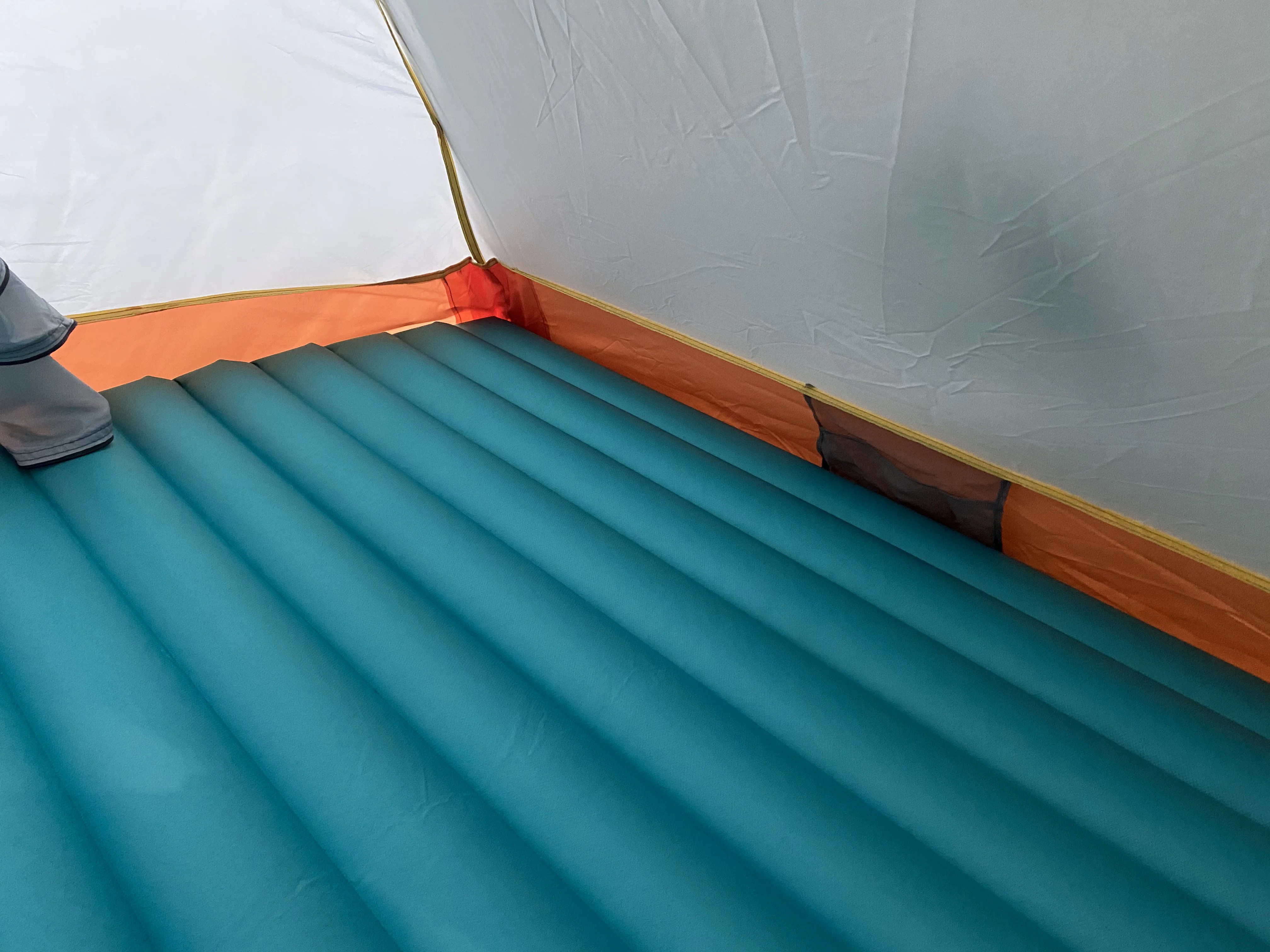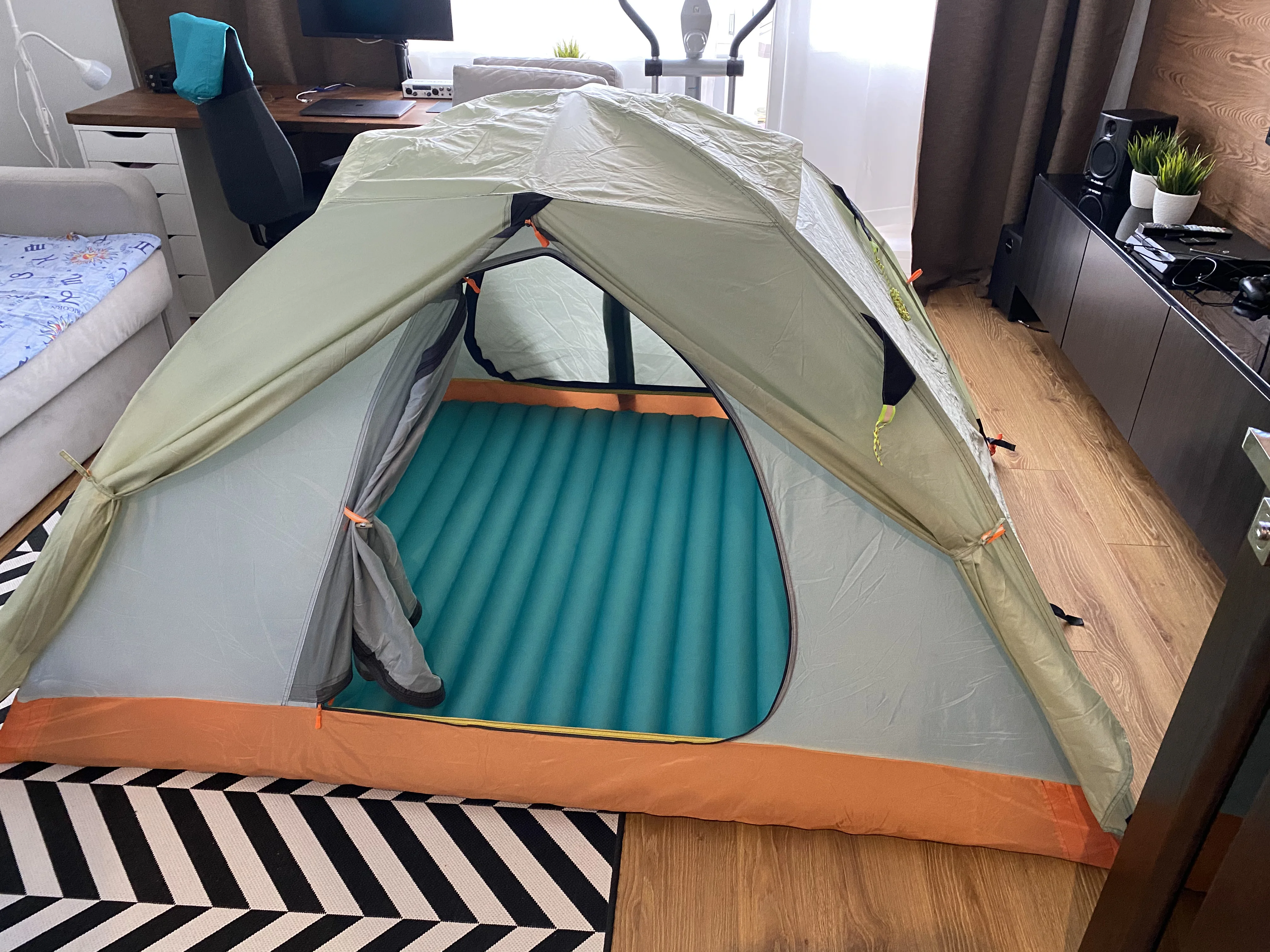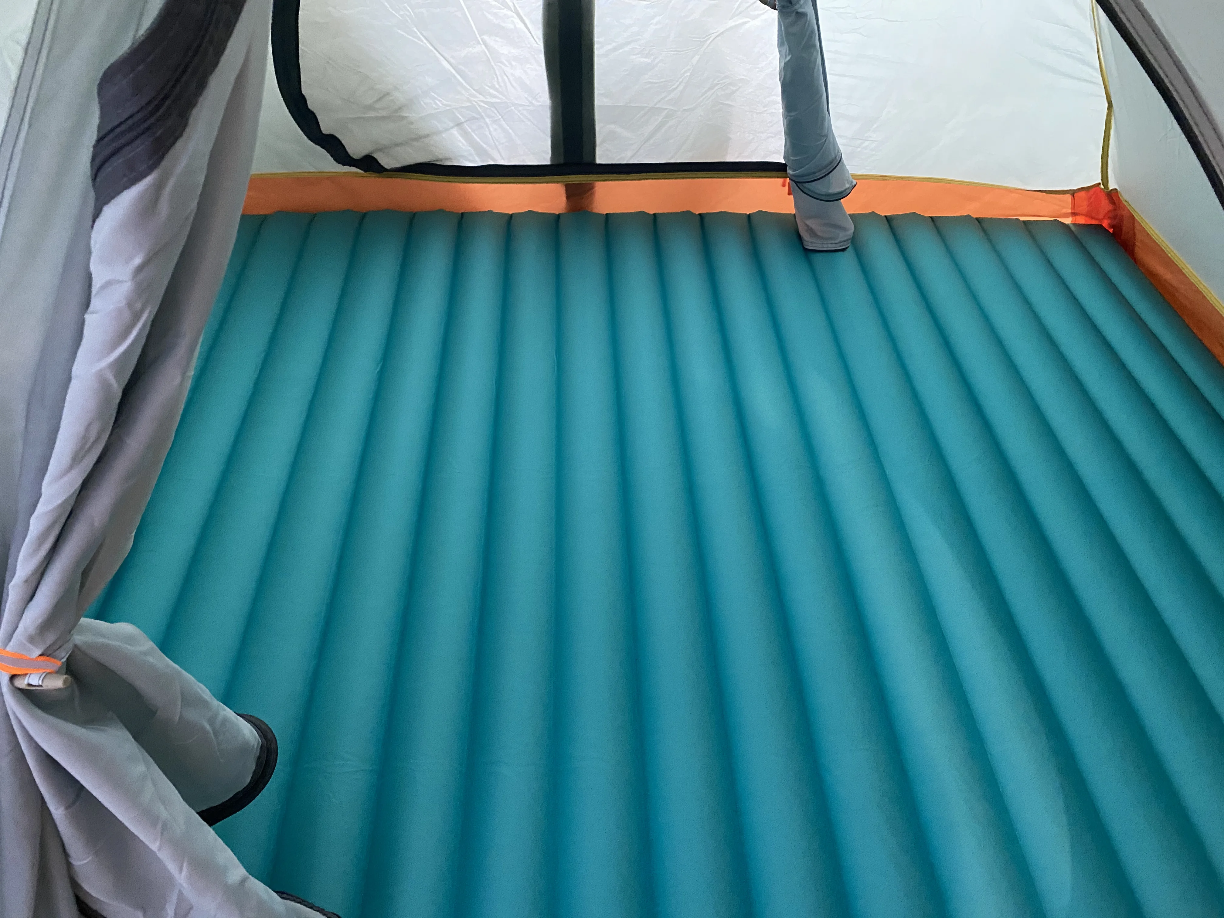 матрас качественный, надувается легко, встроенный насос супер, но он еле залез в двухместную палатку той же фирмы, заявленные размеры которой длинна 205 ширина 125, а у матраса длинна 200 ширина 120, лежать комфортно, ноги и голова упираются немного в палатку, при моем посте 183, если без матраса то ничего не упирается.