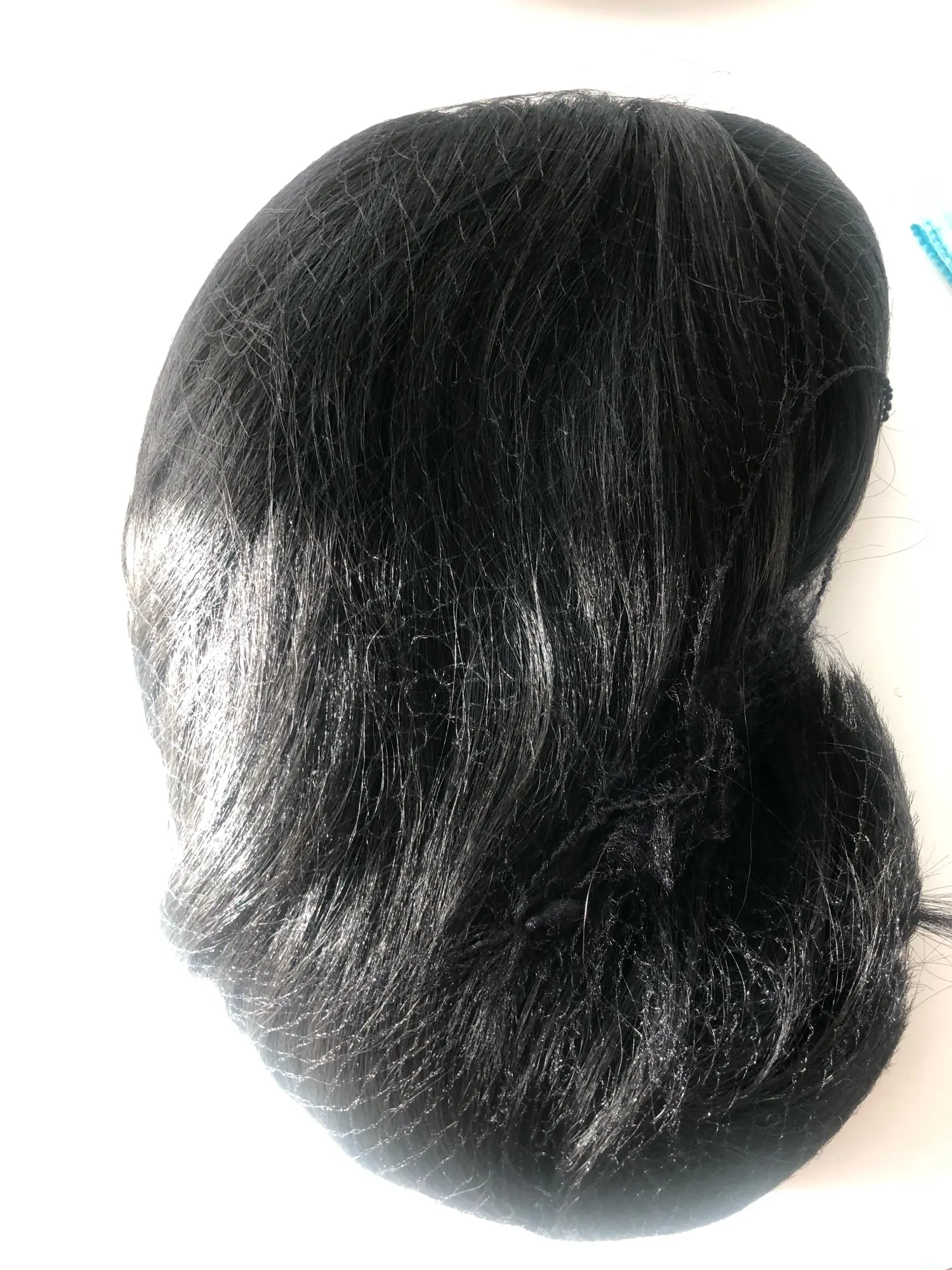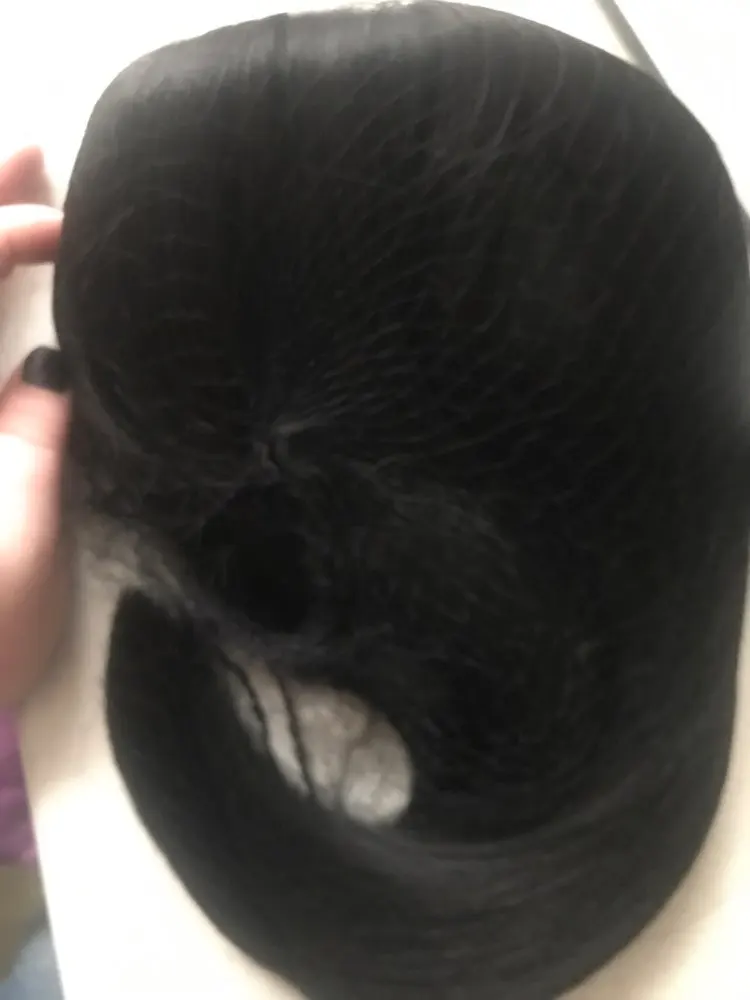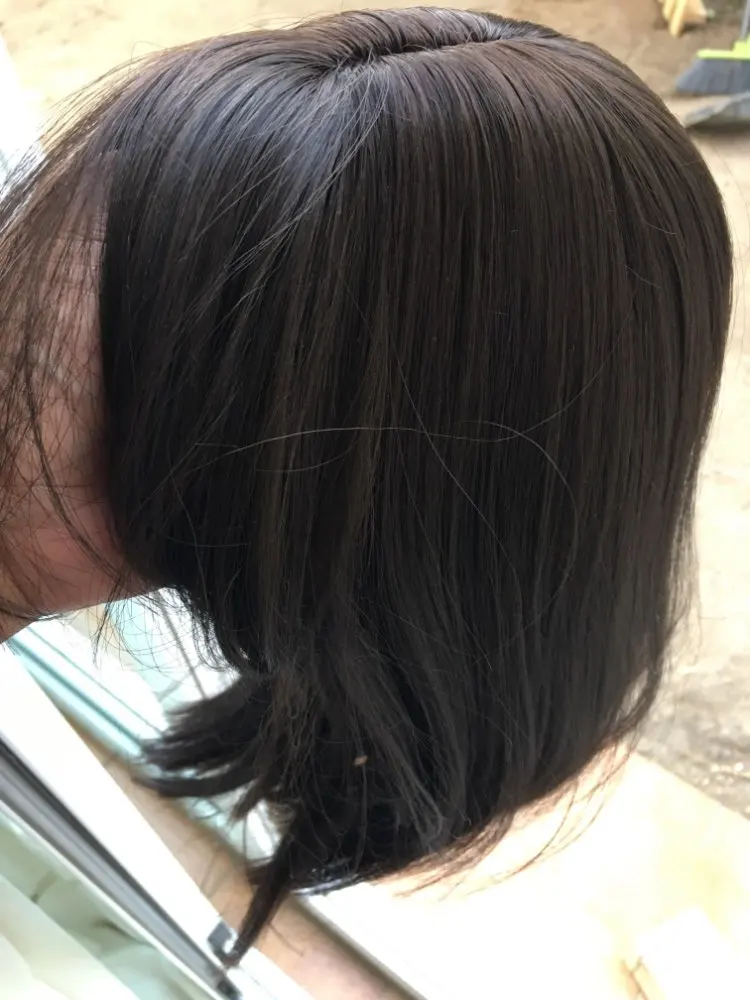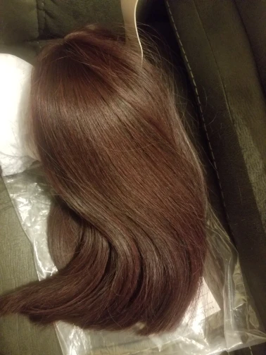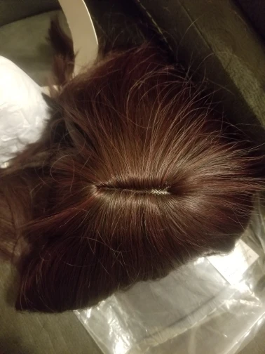 Цвет как темно-каштановый и выглядит очень естественно. У нее много волос и она не запутывается. Челка достаточно длинная, чтобы разрезать ее по своему вкусу. Цвет полоски имитирует очень темную кожу головы на мой вкус. Но его можно раскрашивать полоской с помощью pincelite и основы для макияжа. У него нет гребня или зажима внутри, поэтому я не чувствую себя в безопасности, но их можно купить и сшить. Я бы купил его снова. Быстрая доставка (около 10 дней)