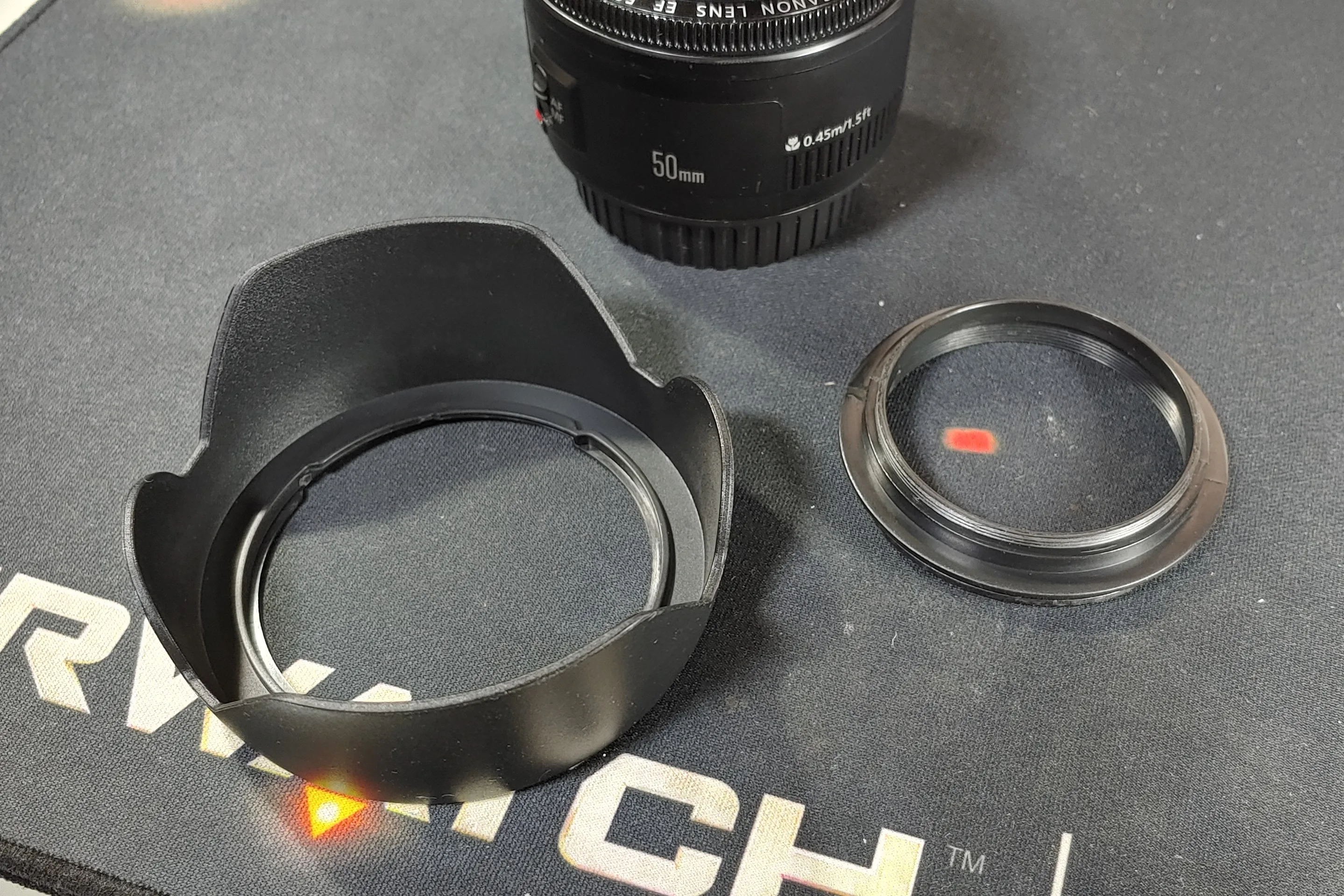 В описании указано, что он совместим с объективом Canon 50 мм, и это не так, он большой.