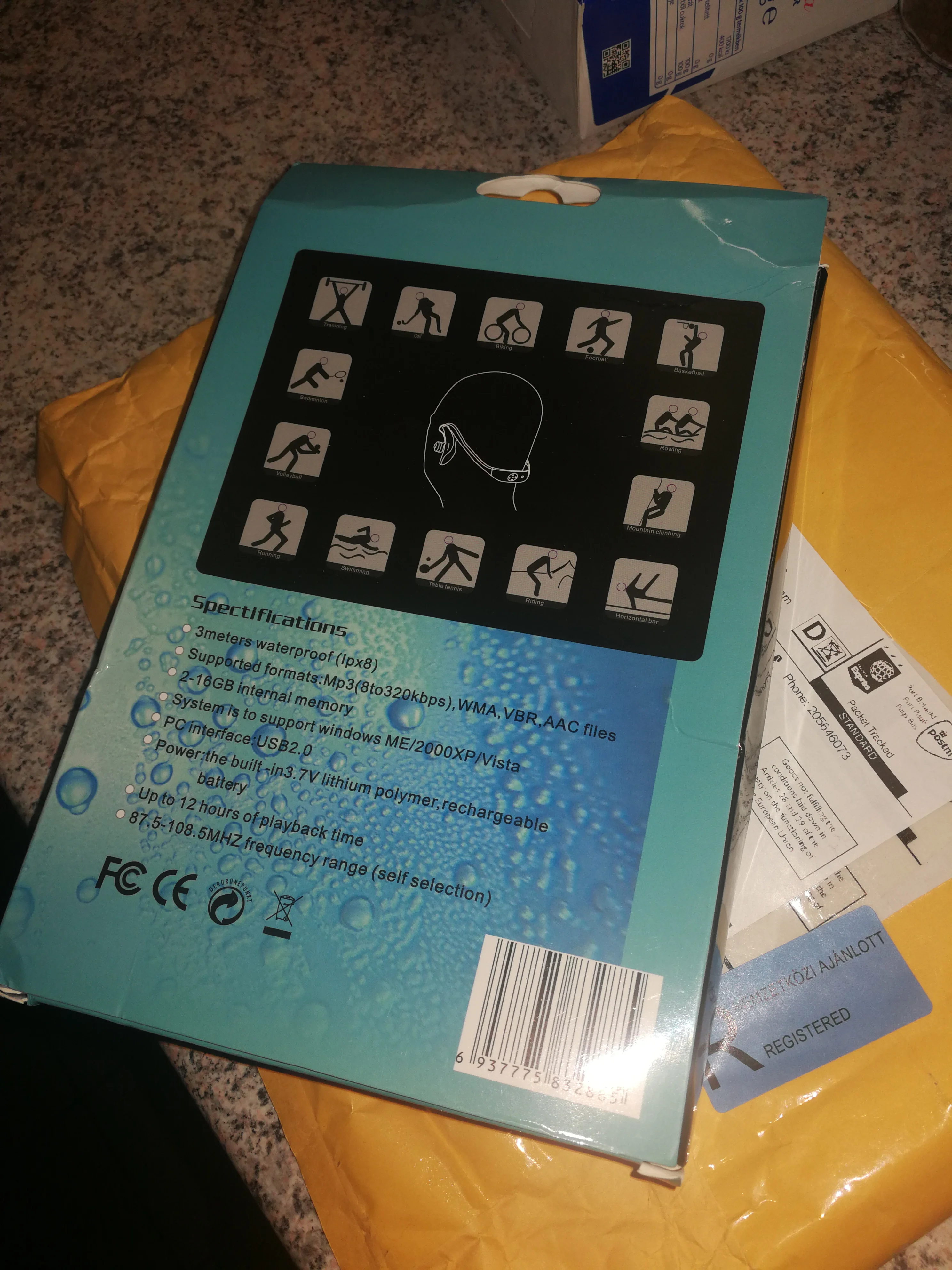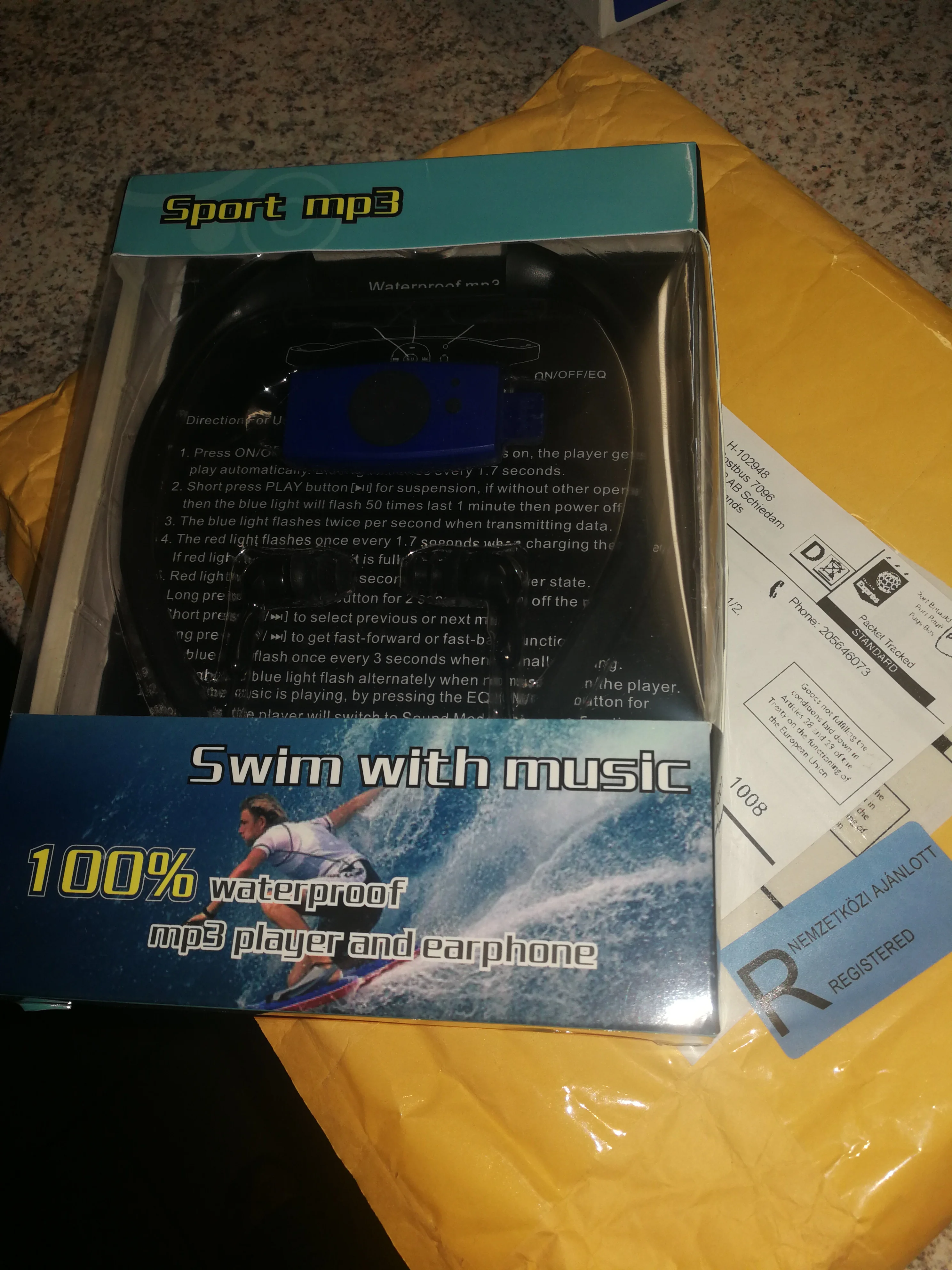 Товар пришел за 12 дней до Мурманска. Опробовала в воде - работает, слушала плеер во время плавания с полным погружением головы в воду. Только сам плеер оставила болтаться на шее, если надеваю, как надо на голову, давит.