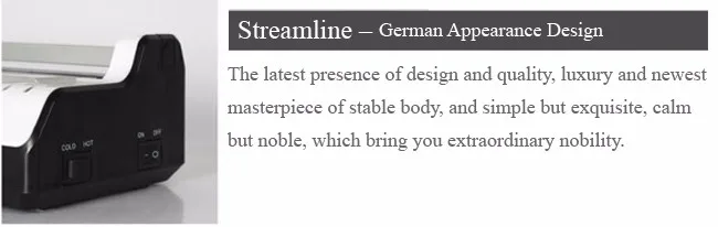 Особенности:Применяемый немецкий дизайн;Типичный черный и белый цвета, ведущий модныйЛаминатор и резак для бумаги, два в одномТри режущего лезвия: прямая линия, сломанная линия и волновая линия.Портативный Круглый Угловой резак, идеальная резкаНаправляющая планка из алюминиевого сплаваИмпортный чип для системы контроля температуры;Hiden внутренняя направляющая дляРезка бумагиПрочныйИнтеллектуальная работа с одной клавишей;ABS анти-блок, вперед и назад свободно;Энергосбережение и экологичность;Функция нагрева, которая согревает зиму;Возможно ламинирование различных размеров в A4/A5/B5, и т. Д., бумагиИзобретенный продукт и эксклюзивное хранение;Международные сертификаты, немецкий GS, CE, ROSH.