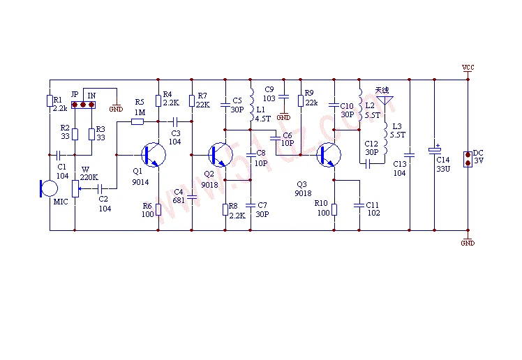Где R1 является сопротивлением смещению микрофона, Обычно выбирается в 2K-5,6 K. R4-это сопротивление коллектора. R5-это базовый резистор, обеспечивающий смещение тока до Q1. R7, R8, C5, L1, C8, C7 для формирования высокочастотного колебания цепи, R7 к базе Q2 для обеспечения смещения, C5 и L1 колебания цепи, Q3, R9, r10, L2, C10, C11 представляют собой высокочастотный усилитель мощности. C8-это отзывы о конденсаторе, R8 от стабильности рабочей точки Q2 DC, конденсатор переменного тока на выходе C7 DC; R9 к транзистору питания Q3 для обеспечения базового тока, схема настройки усиления C10 и L2 и настройка осциллирующей цепи C5 и L1 на той же частоте, чтобы получить максимальную выходную мощность, Расстояние выбросов самое дальнее.