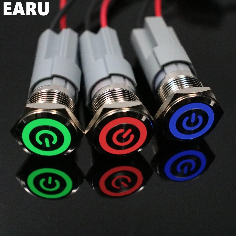 Металлический светодиодный кнопочный переключатель 16 мм, 6 в, 12 В, 24 В, 36 В, 110 В, 220 В, блокировка с фиксацией 1NO, 1NC, красный, синий, желтый, зеленый, белый, водонепроницаемый, IP65 для автомобиля