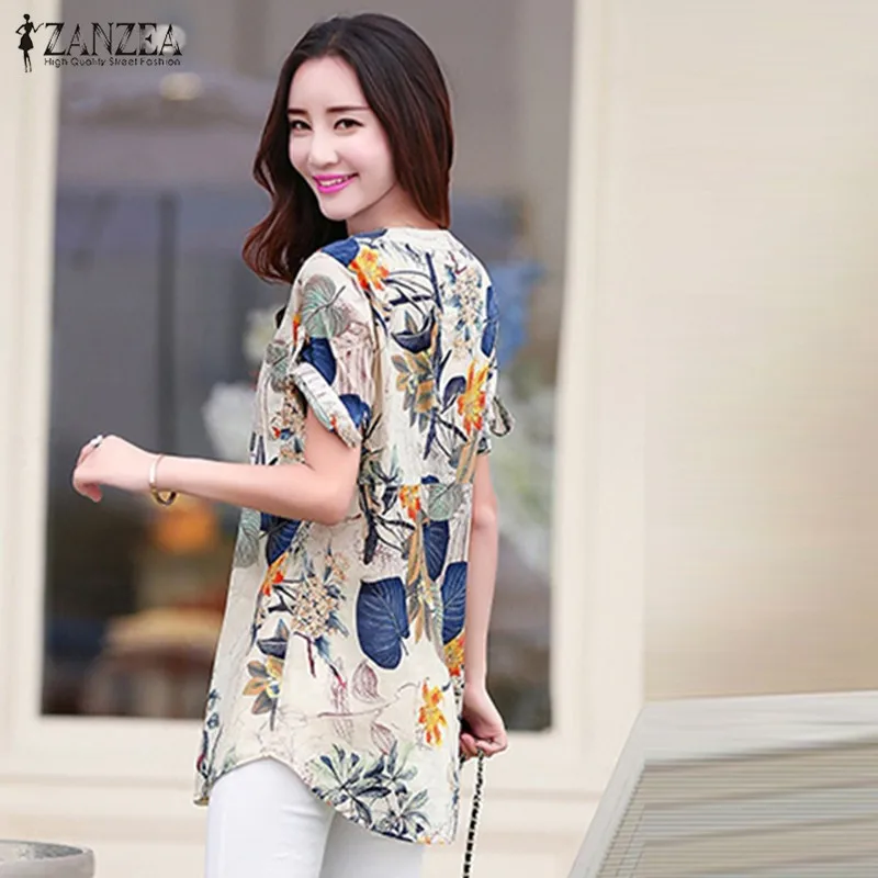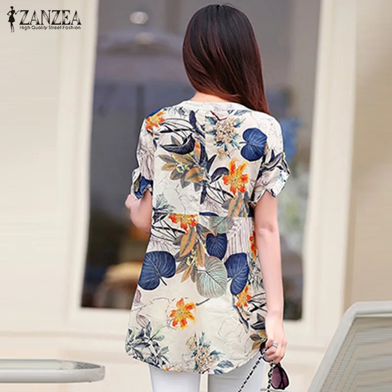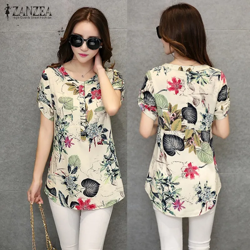 Женская летняя рубашка ZANZEA с коротким рукавом, винтажная блузка с цветочным принтом, повседневные свободные блузки с круглым вырезом для женщин