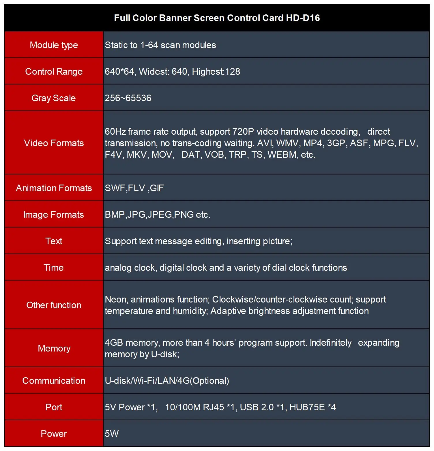 Стандартный модуль Wi-Fi, беспроводное управление мобильным приложением; Поддержка 256 ~ 65536 оттенков серого; Поддержка видео, изображения, анимации, часов, неонового фона; Поддержка word art, анимированный фон, неоновый светильник; U-disk неограниченная Расширительная программа, подключается к трансляции; Нет необходимости устанавливать IP, HD-D16 может быть определена идентификатором контроллера автоматически; Поддержка 4G/Wi-Fi/и удаленного управления кластером сети; Поддержка декодирования видео 720P, выход частоты кадров 60 Гц