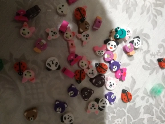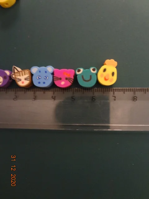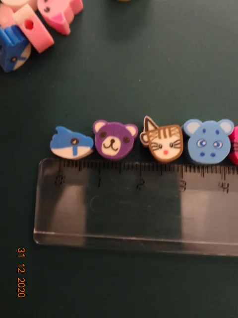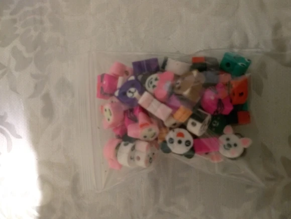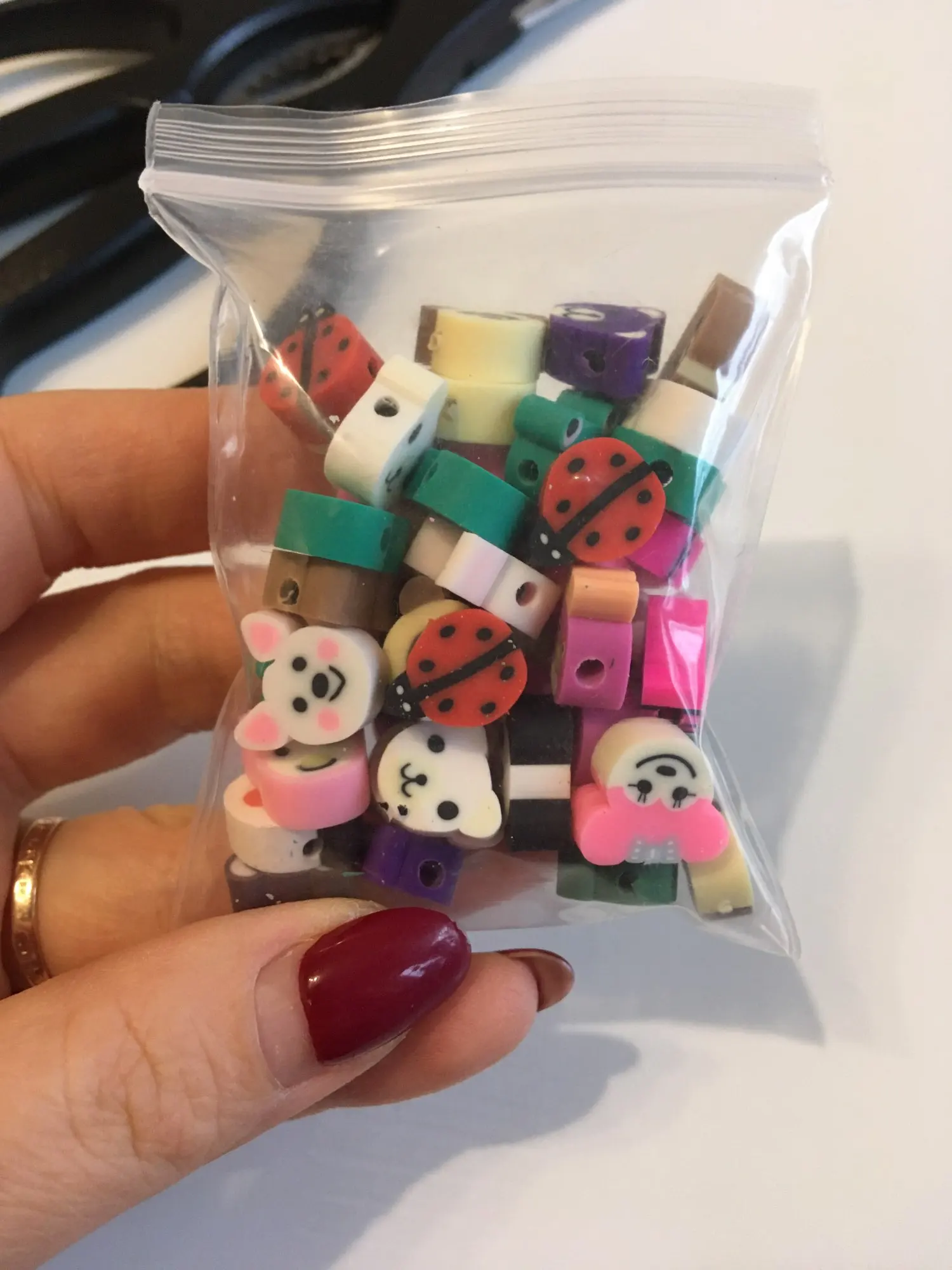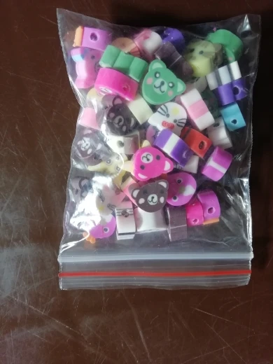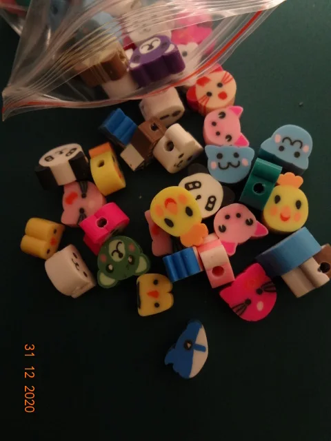 Заказ пришел быстро с другими посылками. Очень много фигурок мишек. Две фигурки были с браком, ( отверстия сделаны очень близко к краю, сразу сломались). Но заказом довольна, ребенок с удовольствием собирает бусы.