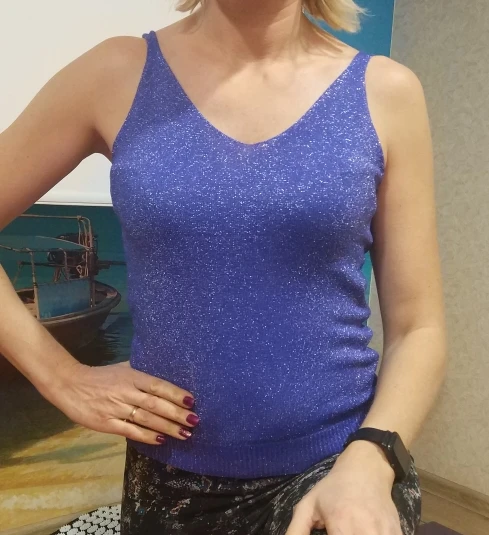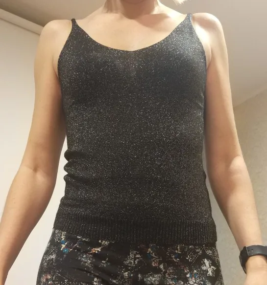 топ классный, тонкий трикотаж, но не просвечивает, так как тёмного цвета. блестит. пришёл за месяц. на мои параметры 92-68-92 не в обтяжку. я очень довольна
